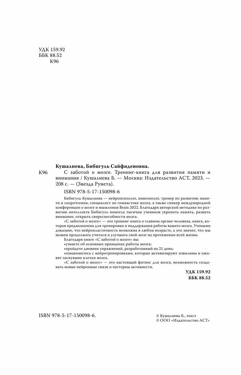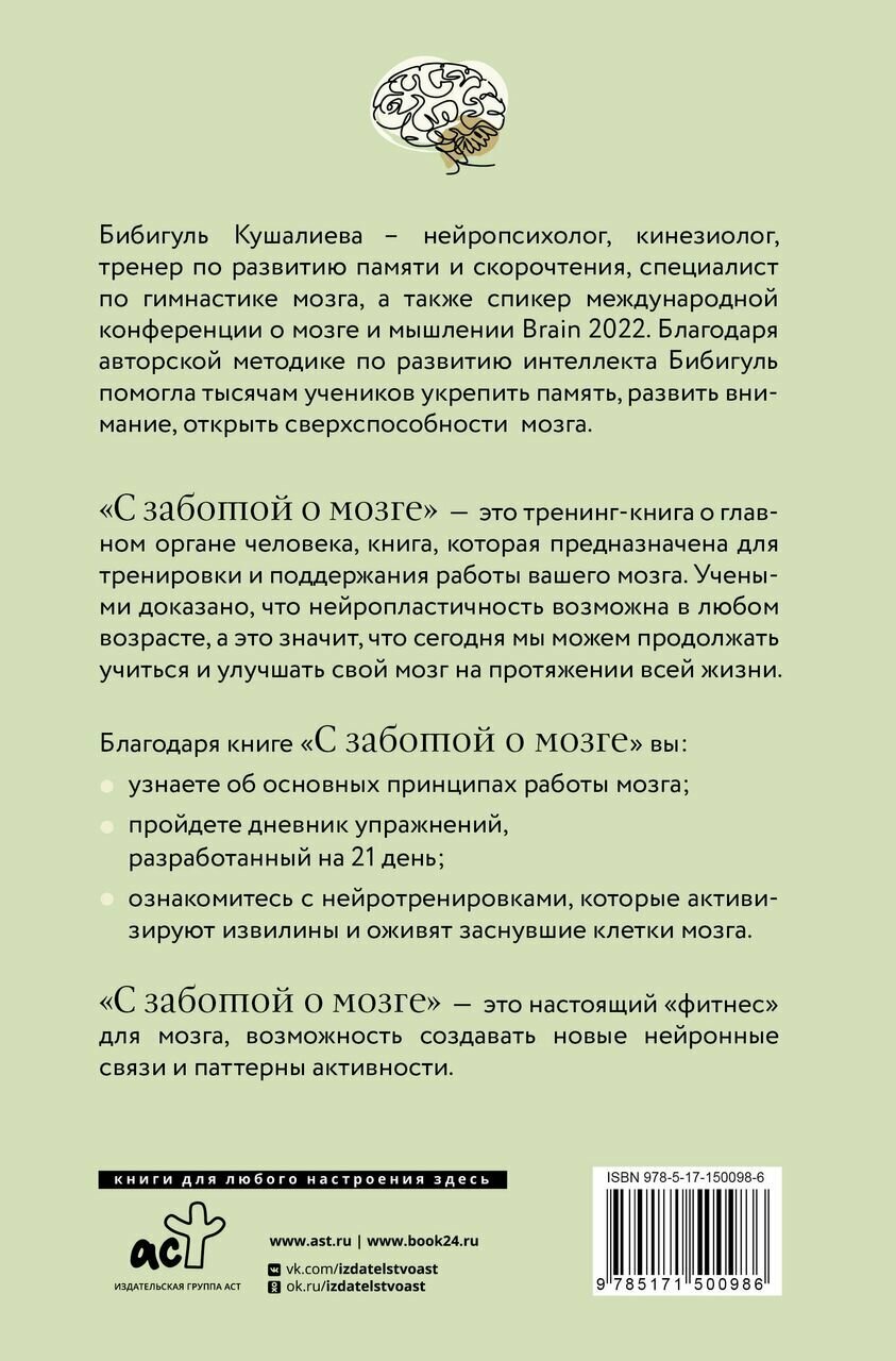 С заботой о мозге. Тренинг-книга для развития памяти и внимания (Бибигуль Кушалиева); Издательство АСТ, 2023