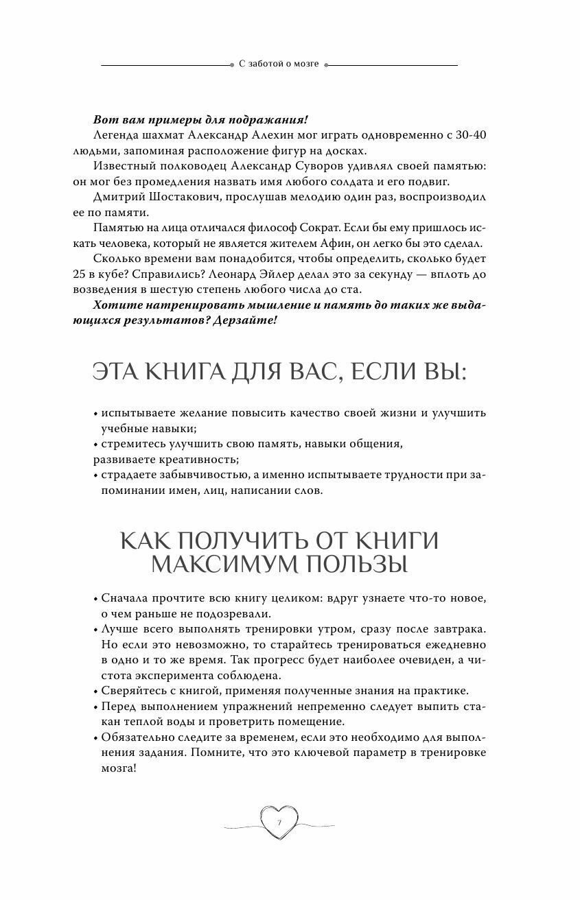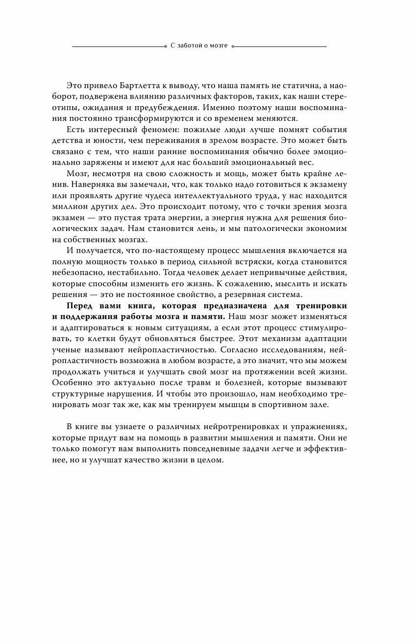 Мозг - самая важная часть организма, поэтому его надо постоянно тренировать, и эта книга идеально для этого подходит. Нескучные упражнения, а так же полезная информация, написанная простым языком, поэтому будет понятна даже тем, кто не разбирается в медицине.