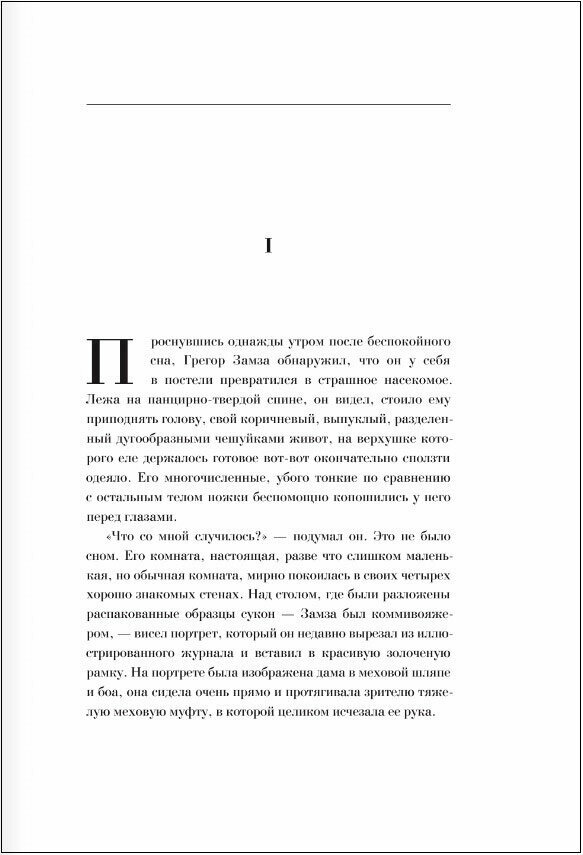 Большинство произведений данного автора тяжелы для понимания, написаны сложным и понятным далеко не каждому языком. "Превращение" — творение Кафки, язык которого настолько прост и понятен, что каждый способен извлечь из него что-то лично для себя. Может, даже по-другому взглянуть на жизнь и окружающих.