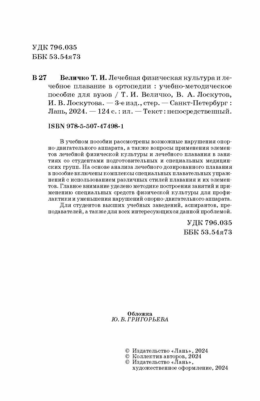 Лечебная физическая культура и лечебное плавание в ортопедии. Учебно-методическое пособие для вузов (Величко Татьяна Ивановна, Лоскутов Владимир Александрович, Лоскутова Ирина Владимировна); Лань, 2023