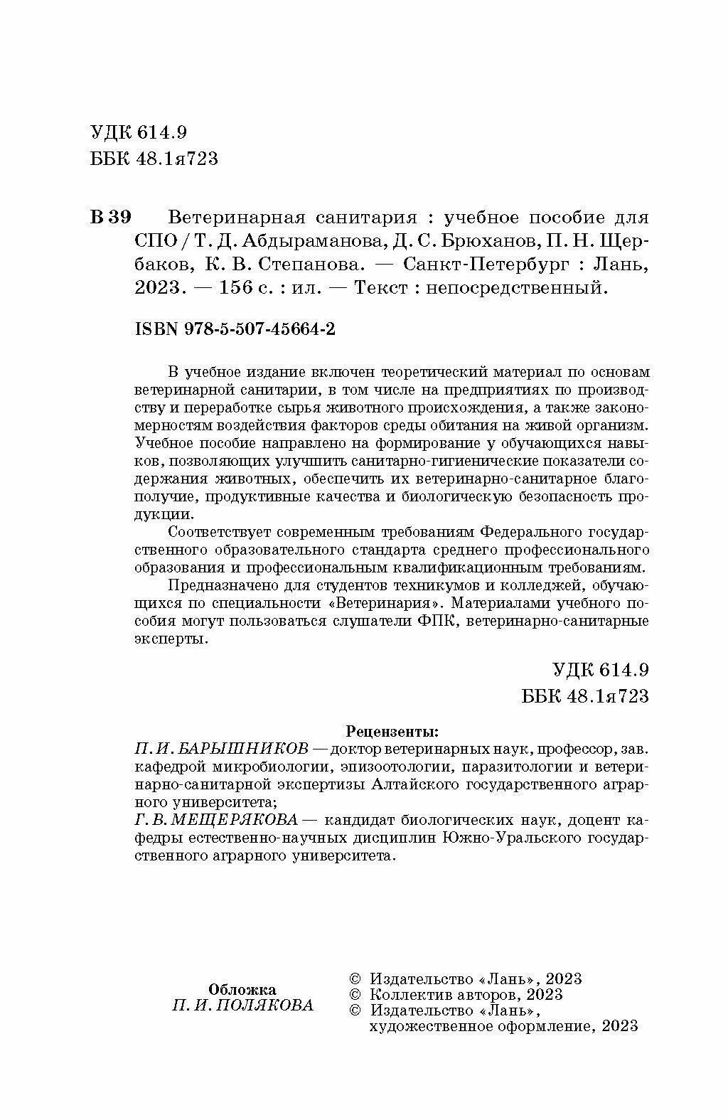 Книга: Ветеринарная санитария (Абдыраманова Татьяна Дзепшевна, Щербаков Павел Николаевич, Брюханов Дмитрий Сергеевич); Лань, 2023