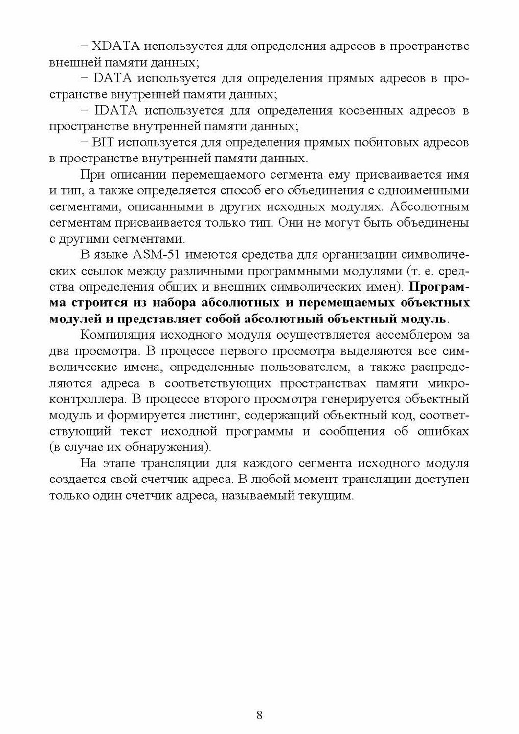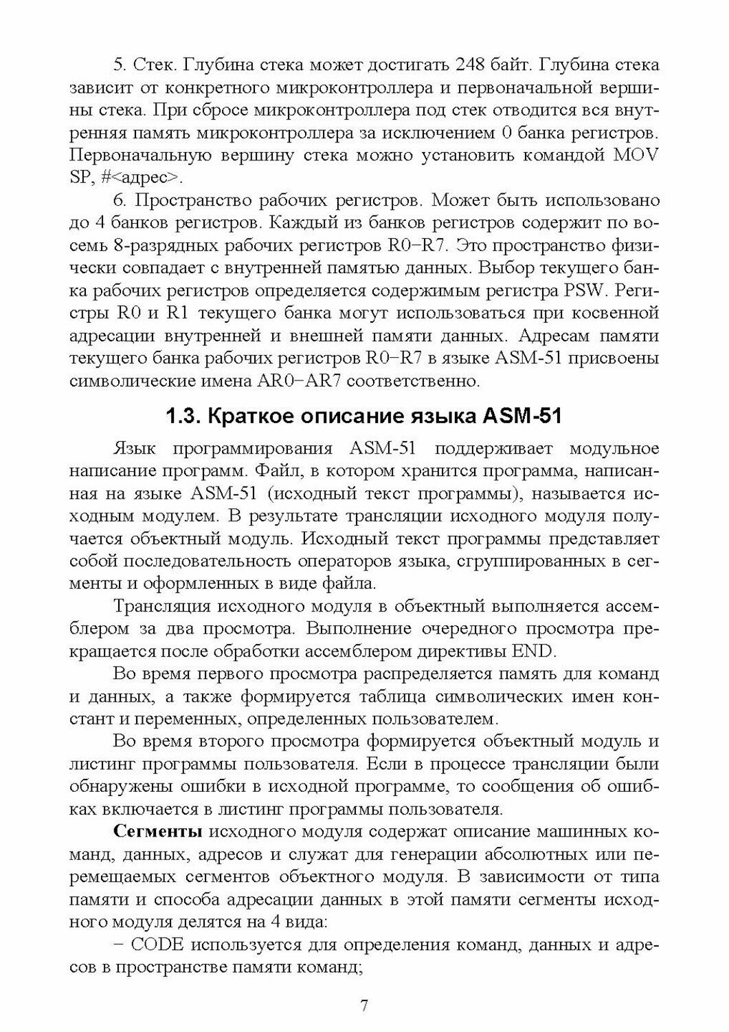 Учебное пособие содержит описание языка ASM-51, используемого для создания загрузочных кодов для микропроцессоров семейства MCS-51. Изложена вся необходимая информация для программирования на языке ASM-51 и объяснены особенности использования программы-компилятора asm51.exe. В пособии приводятся общие сведения об операторах языка программирования ASM-51, типах данных, используемых в этом языке программирования, управляющих директивах, кроме того, приведены примеры программ.