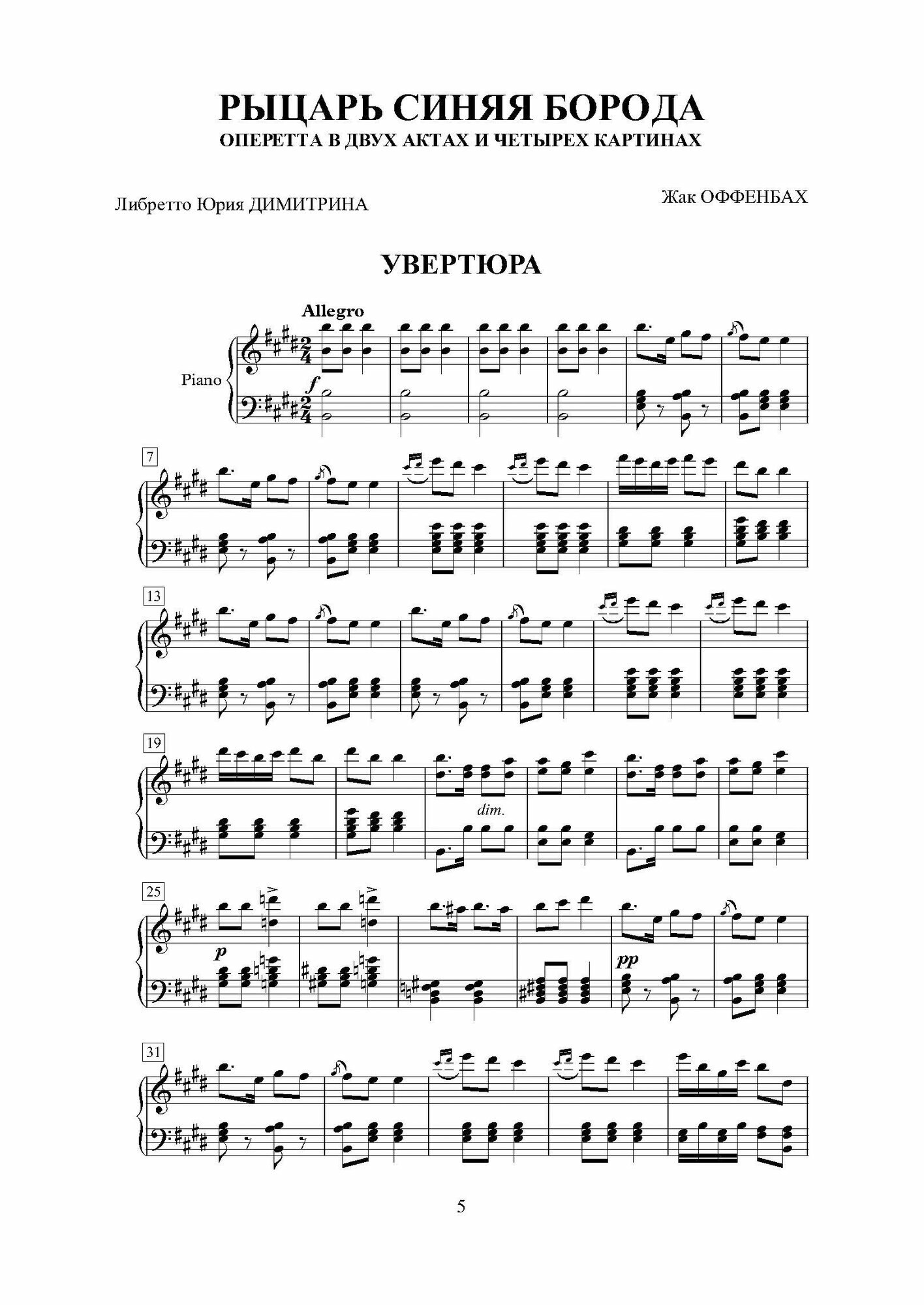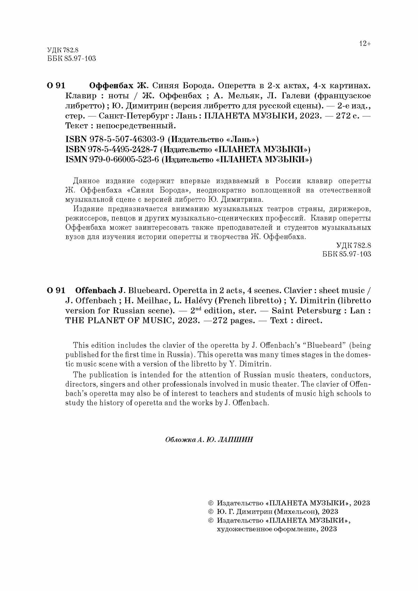 Данное издание содержит впервые издаваемый в России клавир оперетты Ж. Оффенбаха «Синяя Борода», неоднократно воплощенной на отечественной музыкальной сцене с версией либретто Ю. Димитрина. Издание предназначается вниманию музыкальных театров страны, дирижеров, режиссеров, певцов и других музыкально-сценических профессий. Клавир оперетты Оффенбаха может заинтересовать также преподавателей и студентов музыкальных вузов для изучения истории оперетты и творчества Ж. Оффенбаха.