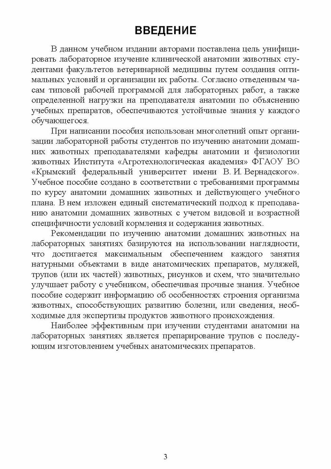 В данном учебном пособии авторами поставлена цель унифицировать лабораторное изучение клинической анатомии животных студентами факультетов ветеринарной медицины путем создания оптимальных условий и организации их работы. При написании пособия использован многолетний опыт организации лабораторной работы студента по изучению анатомии домашних животных преподавателями кафедры анатомии и физиологии животных Института «Агротехнологическая академия» ФГАОУ ВО «Крымский федеральный университет имени В. И. Вернадского». Учебное пособие создано в соответствии с требованиями программы по курсу анатомии домашних животных и действующего учебного плана. В нем изложен единый систематический подход к преподаванию анатомии домашних животных с учетом видовой и возрастной специфичности условий кормления и содержания животных.