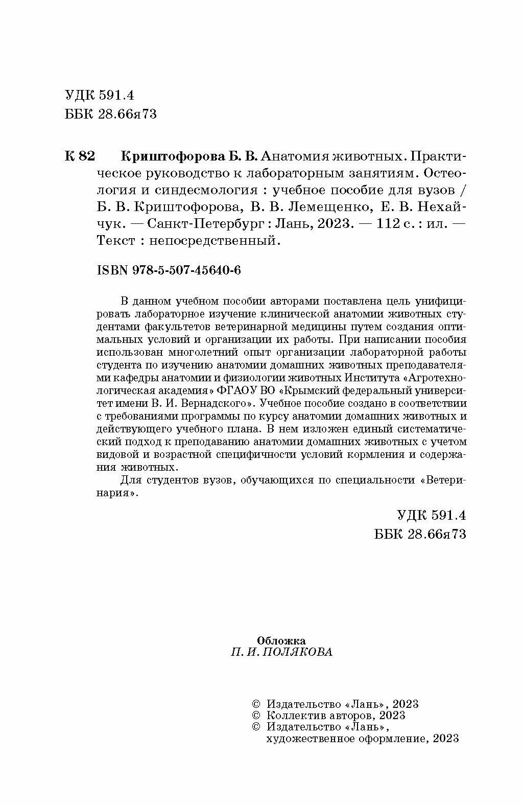 Анатомия животных. Практическое руководство к лабораторным занятиям. Остеология и синдесмология (Криштофорова Бесса Владиславовна, Лемещенко Владимир Владимирович, Нехайчук Елена Валериевна); Лань, 2023