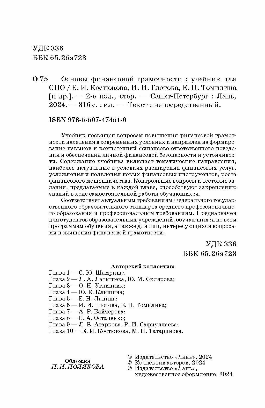 Основы финансовой грамотности. Учебник для СПО (Костюкова Елена Ивановна, Томилина Елена Петровна, Глотова Ирина Ивановна); Лань, 2024