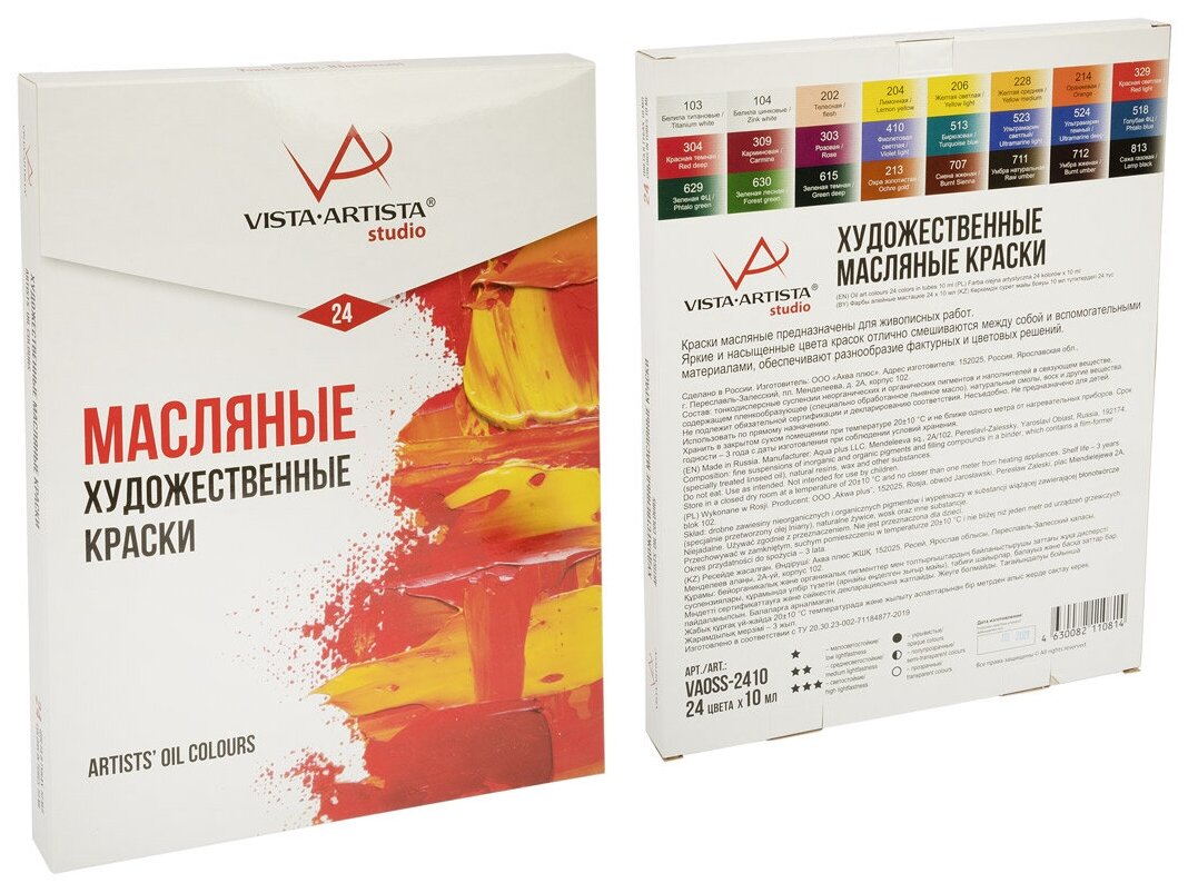 Художественные масляные краски Vista-Artista Studio - обширная палитра цветов с хорошей укрывистостью и высокой светостойкостью. Яркие и насыщенные цвета красок отлично смешиваются между собой и вспомогательными материалами, и позволяют получить разнообразие фактурных и цветовых решений.
