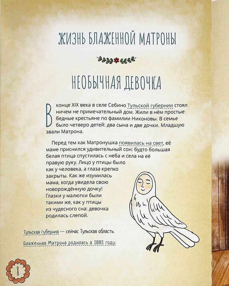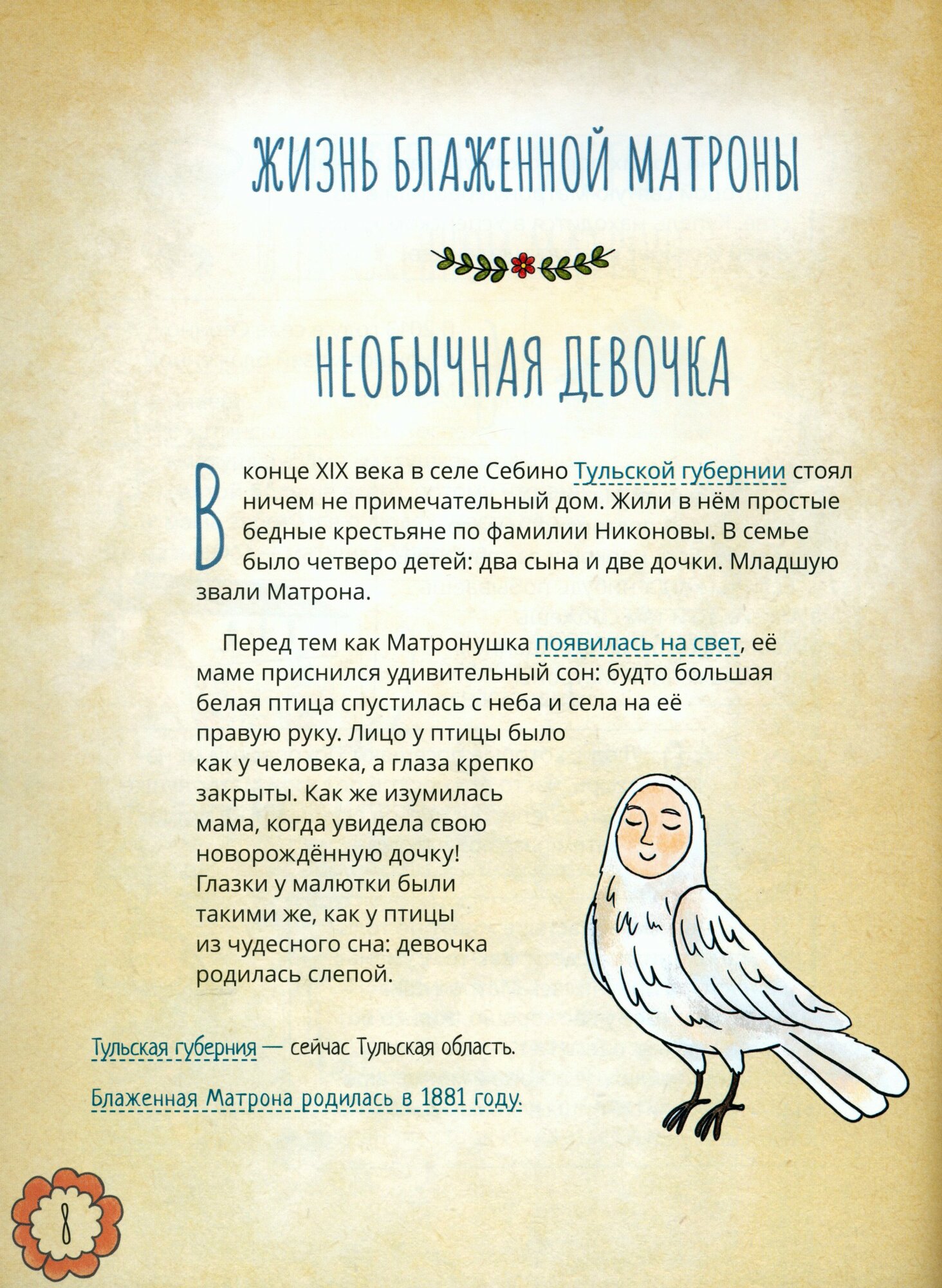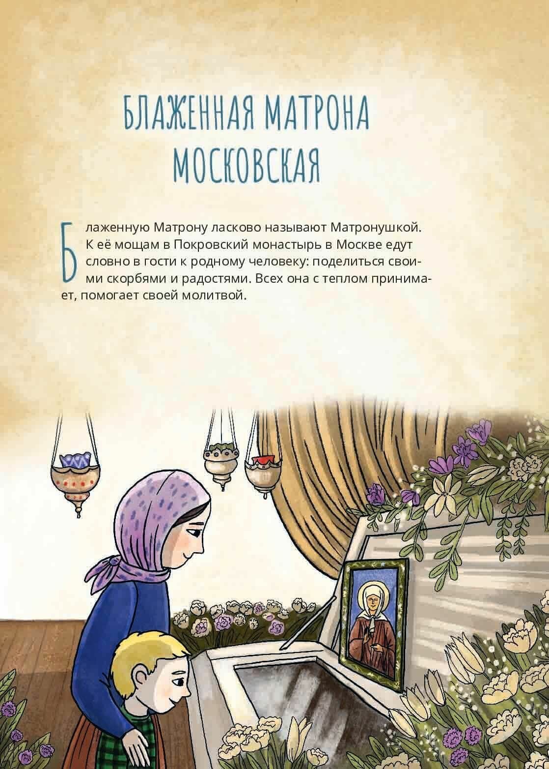 Святая блаженная Матрона Московская очень близка к нам по времени - она жила в ХХ веке. Люди ласково называют ее "Матронушкой". И москвичи, и жители всей России едут в Покровский монастырь к ней, как к родному человеку: кто-то просит об исцелении, кто-то о помощи в житейских скорбях, кто-то обращается с просьбой об устройстве личной жизни. И ни один человек не отходит неуслышанным, потому-то очередь к ее мощам не оскудевает. Перед своей кончиной блаженная Матрона сказала: "Все, все приходите ко мне рассказывайте, как живой, о своих скорбях, я буду вас видеть, и слышать, и помогать вам". В этой книге рассказывается о нелегком жизненном пути блаженной старицы.