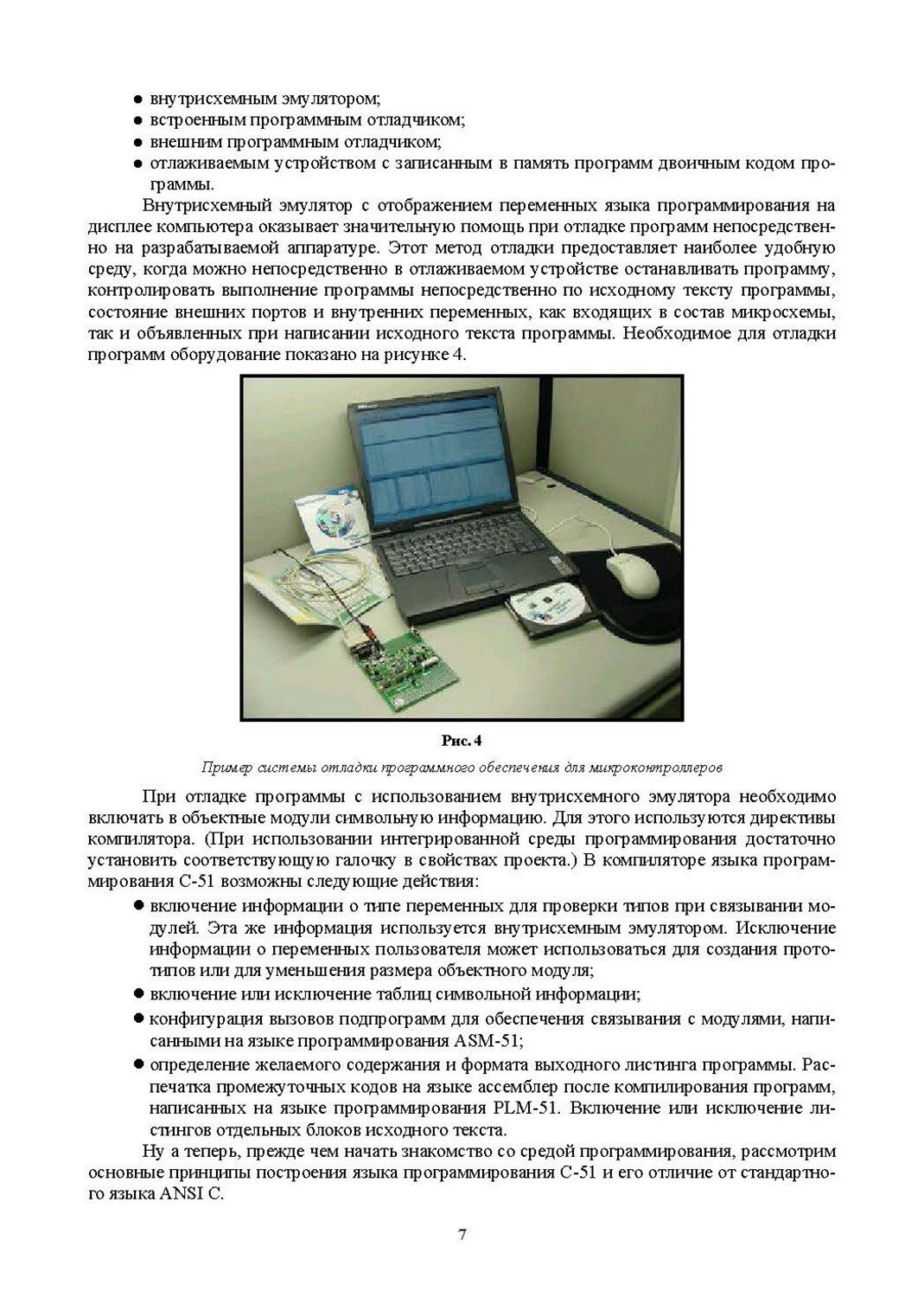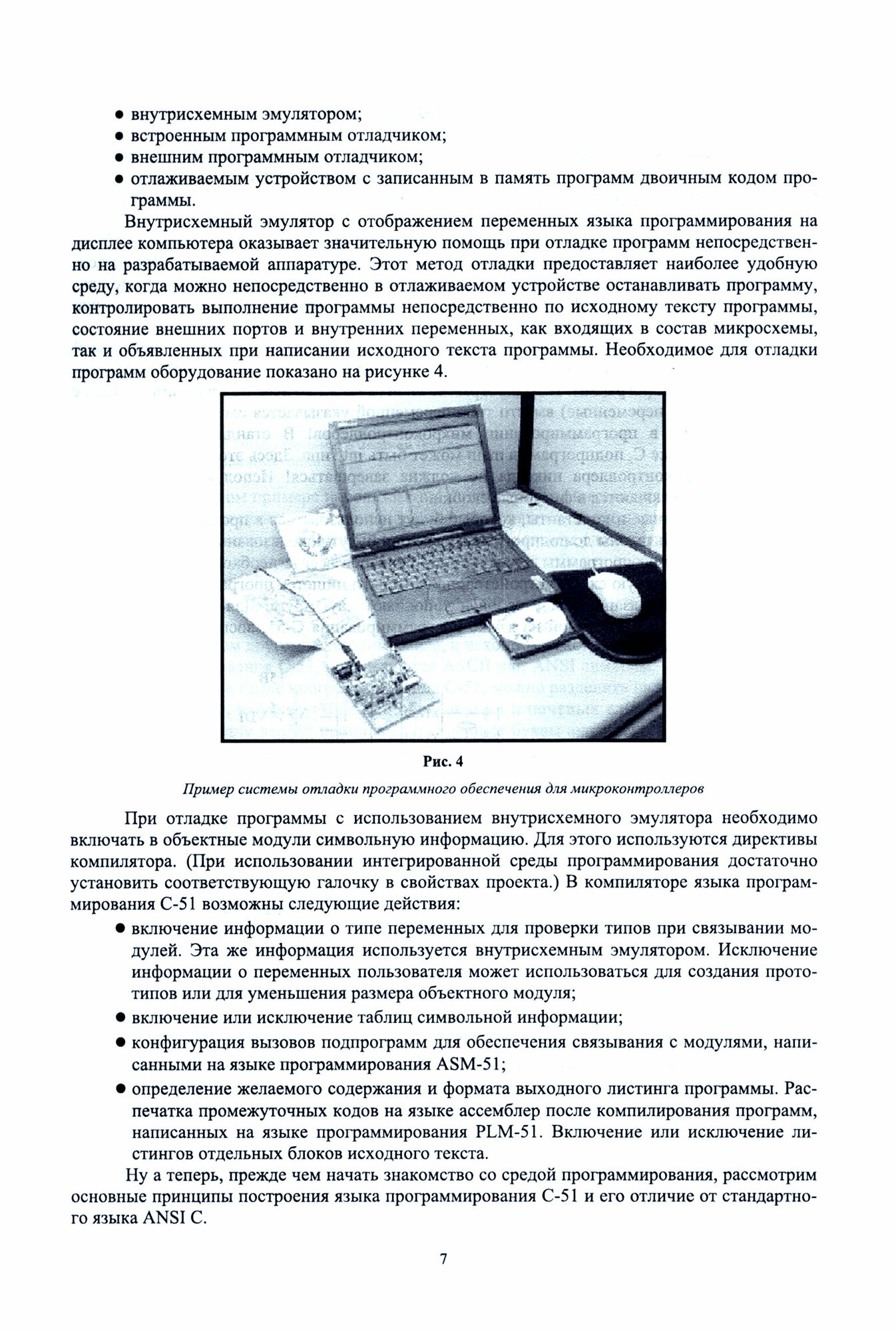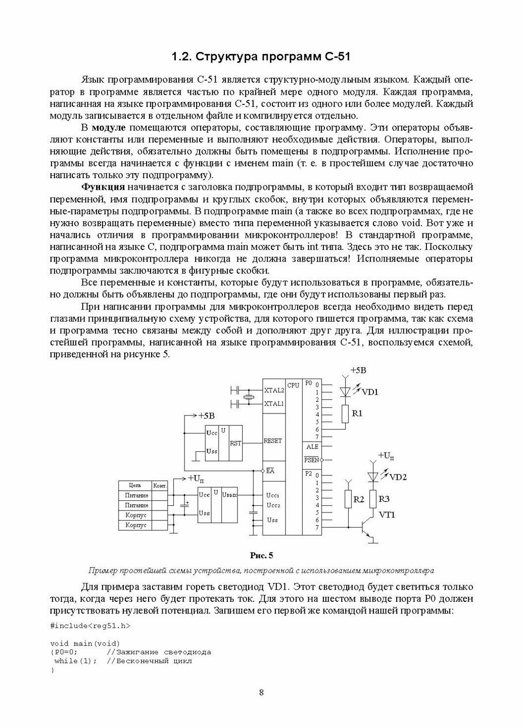 Учебное пособие содержит описание языка C-51, используемого для создания загрузочных кодов для микропроцессоров семейства MCS-51. Изложена необходимая информация для программирования на языке C-51 и объяснены особенности использования программы-компилятора. Приводятся общие сведения об операторах языка программирования C-51, типах данных, используемых в этом языке программирования, управляющих директивах, кроме того, в рассмотрены примеры программ. Пособие может быть полезным при изучении программирования для любого микроконтроллера семейства микроконтроллеров MCS-51, в том числе для отечественных микроконтроллеров серии 1816 и 1830 или для наиболее распространенных в настоящее время микроконтроллеров серии AT89xx фирмы Atmel.