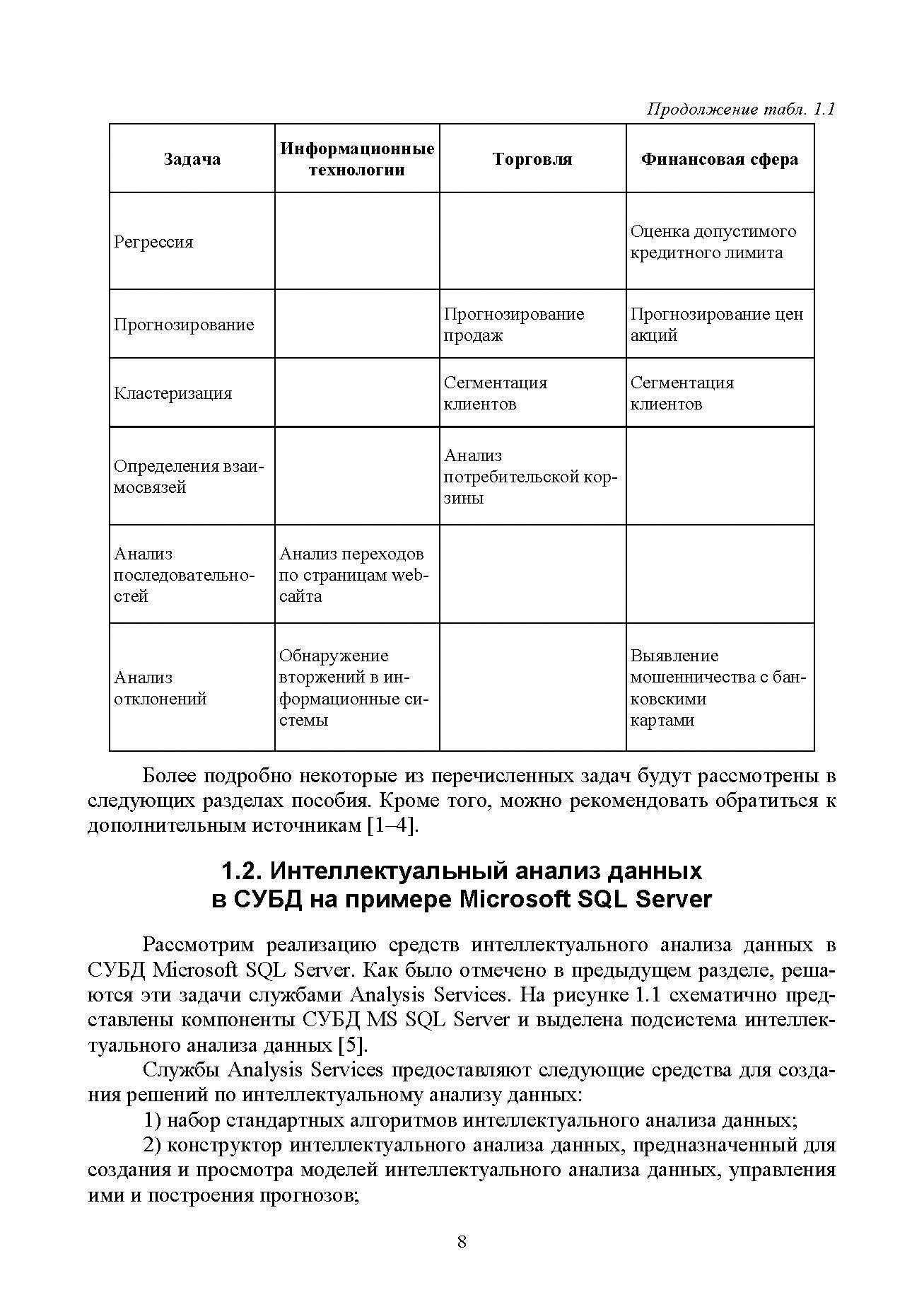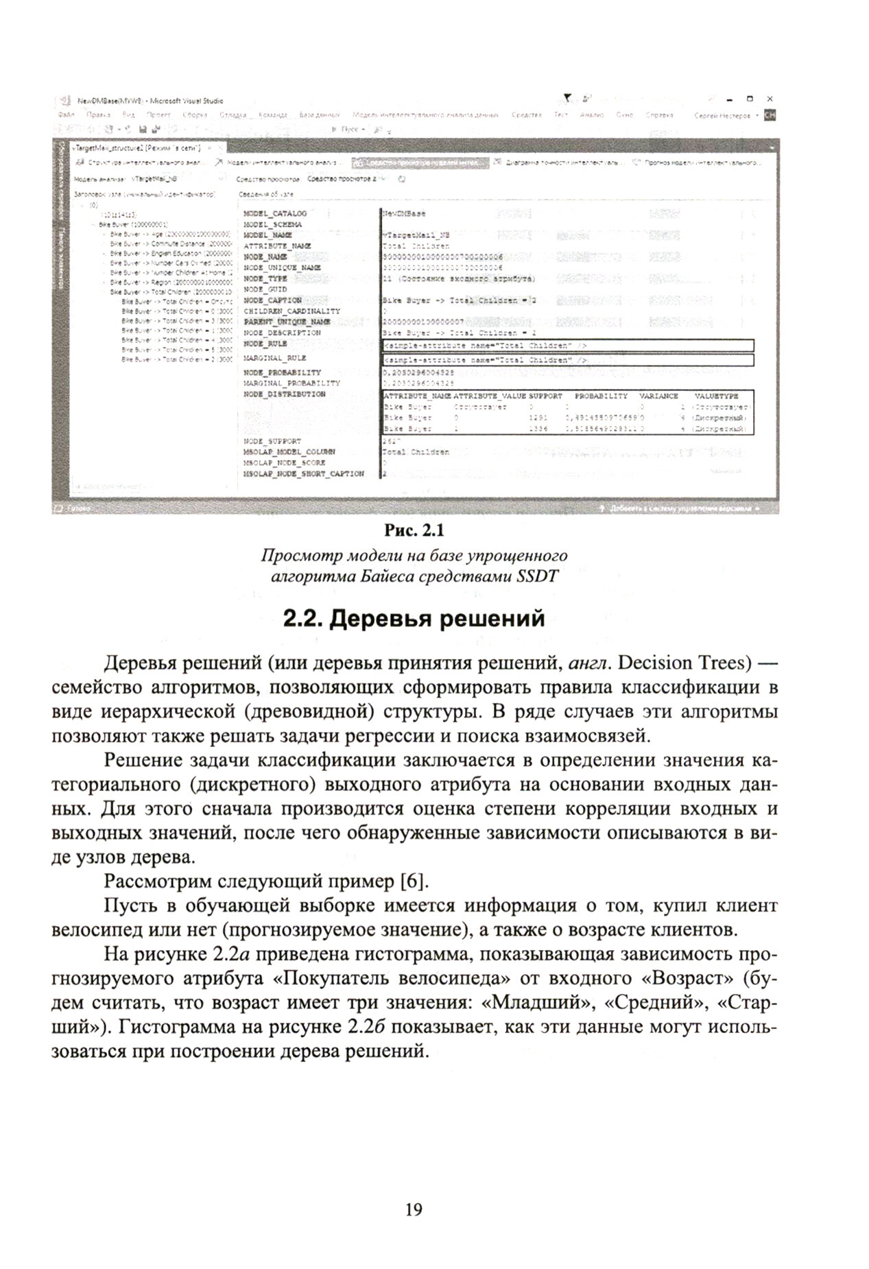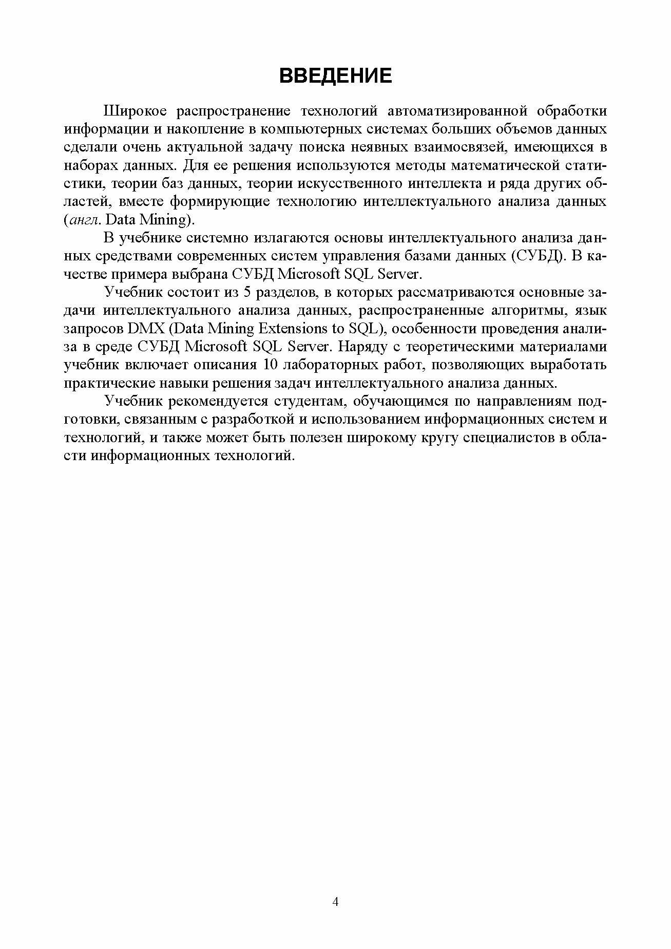 Системно излагаются основы интеллектуального анализа данных средствами современных систем управления базами данных (СУБД). В качестве примера выбрана СУБД Microsoft SQL Server 2019. Рассматриваются основные задачи интеллектуального анализа данных, распространенные алгоритмы, язык запросов DMX (Data Mining eXtensions to SQL), особенности проведения анализа в среде СУБД Microsoft SQL Server 2019. Наряду с теоретическими материалами, учебник включает описания лабораторных работ, позволяющих выработать практические навыки решения задач интеллектуального анализа данных.