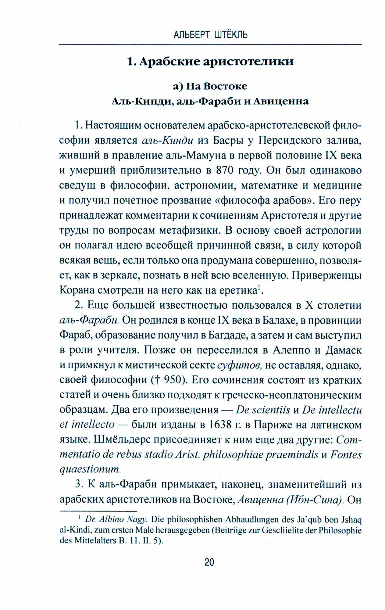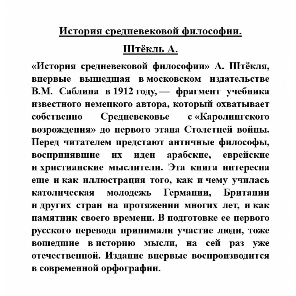 «История средневековой философии» А. Штёкля, впервые вышедшая в московском издательстве В.М. Саблина в 1912 году, — фрагмент учебника известного немецкого автора, который охватывает собственно Средневековье с «Каролингского возрождения» до первого этапа Столетней войны. Перед читателем предстают античные философы, воспринявшие их идеи арабские, еврейские и христианские мыслители. Эта книга интересна еще и как иллюстрация того, как и чему училась католическая молодежь Германии, Британии и других стран на протяжении многих лет, и как памятник своего времени. В подготовке ее первого русского перевода принимали участие люди, тоже вошедшие в историю мысли, на сей раз уже отечественной. Издание впервые воспроизводится в современной орфографии.