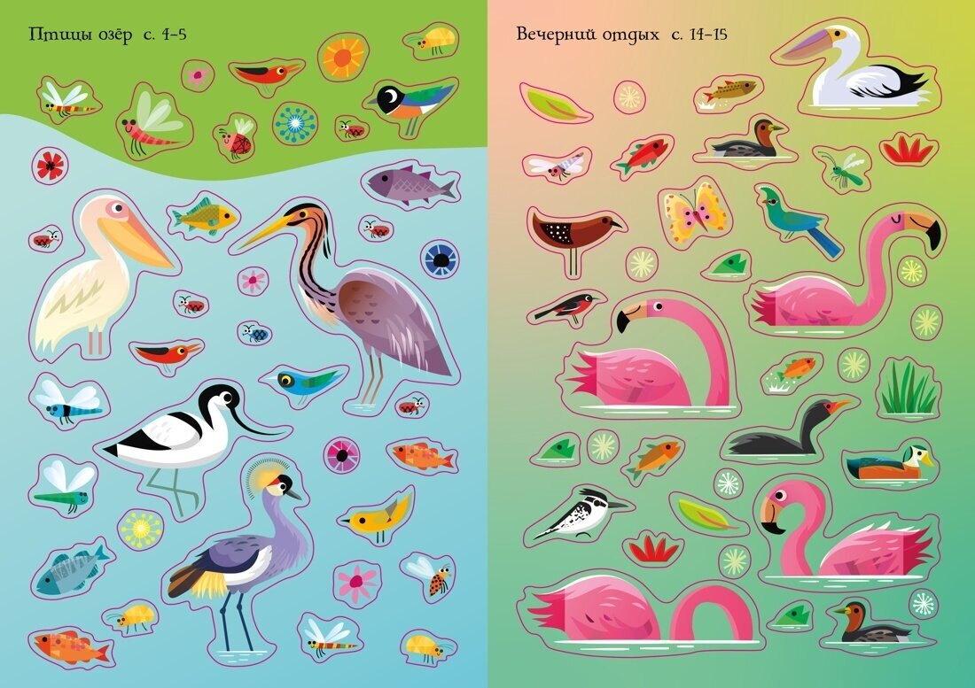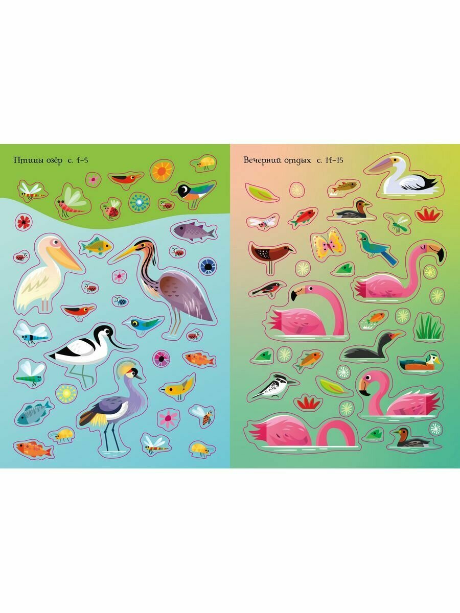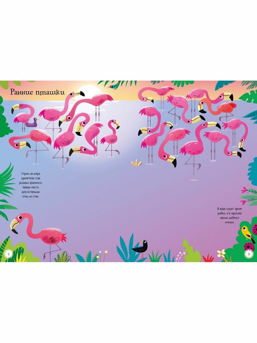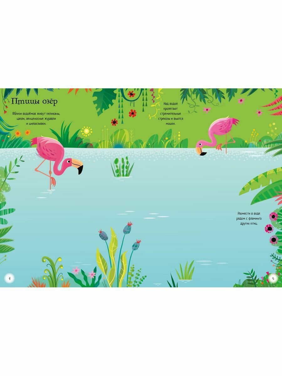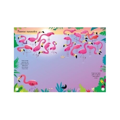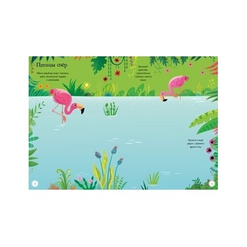 На озере обитают розовые фламинго. Посмотри, как проходит их день, а заодно познакомься с другими птицами, живущими на воде: журавлями, цаплями, шилоклювками и пеликанами.