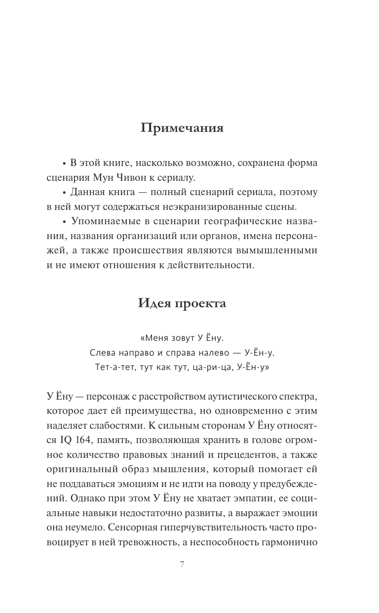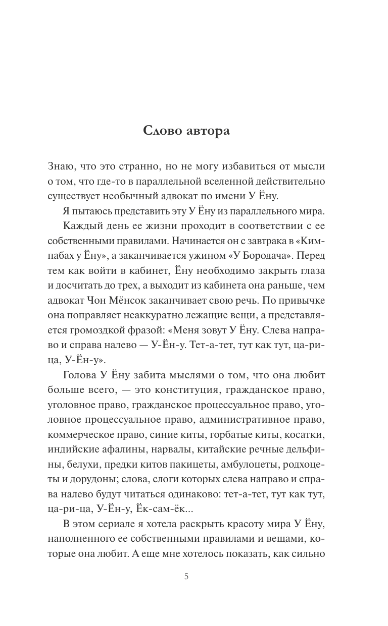 Знаю, что это странно, но не могу избавиться от мысли о том, что где-то в параллельной вселенной действительно существует необычный адвокат по имени У Ёну. Я пытаюсь представить эту У Ёну из параллельного мира. Каждый день ее жизни проходит в соответствии с ее собственными правилами. Начинается он с завтрака в «Кимпабах у Ёну», а заканчивается ужином «У Бородача». Перед тем как войти в кабинет, Ёну необходимо закрыть глаза и досчитать до трех, а выходит из кабинета она раньше, чем адвокат Чон Мёнсок заканчивает свою речь. По привычке она поправляет неаккуратно лежащие вещи, а представляется громоздкой фразой: «Меня зовут У Ёну. Слева направо и справа налево — У-Ён-у. Тет-а-тет, тут как тут, ца-ри- ца, У-Ён-у». Голова У Ёну забита мыслями о том, что она любит больше всего, — это конституция, гражданское право, уголовное право, гражданское процессуальное право, уголовное процессуальное право, административное право, коммерческое право, синие киты, горбатые киты, косатки, индийские афалины, нарвалы, китайские речные дельфины, белухи, предки китов пакицеты, амбулоцеты, родхоцеты и дорудоны; слова, слоги которых слева направо и справа налево будут читаться одинаково: тет-а-тет, тут как тут, ца-ри-ца, У-Ён-у, Ёк-сам-ёк В этом сериале я хотела раскрыть красоту мира У Ёну, наполненного ее собственными правилами и вещами, которые она любит. А еще мне хотелось показать, как сильно она нравится мне самой. И я была бы рада, если бы и зрители полюбили ее настолько же сильно. Адвокат У Ёну из параллельного мира вряд ли стала бы интересоваться мной или вами. Ведь мы не киты и даже не обаятельный и добрый Ли Чунхо. Что ж, пусть. В этом неповторимое очарование У Ёну. А мне хочется лишь одного: пусть она всегда будет счастлива в своей параллельной вселенной.