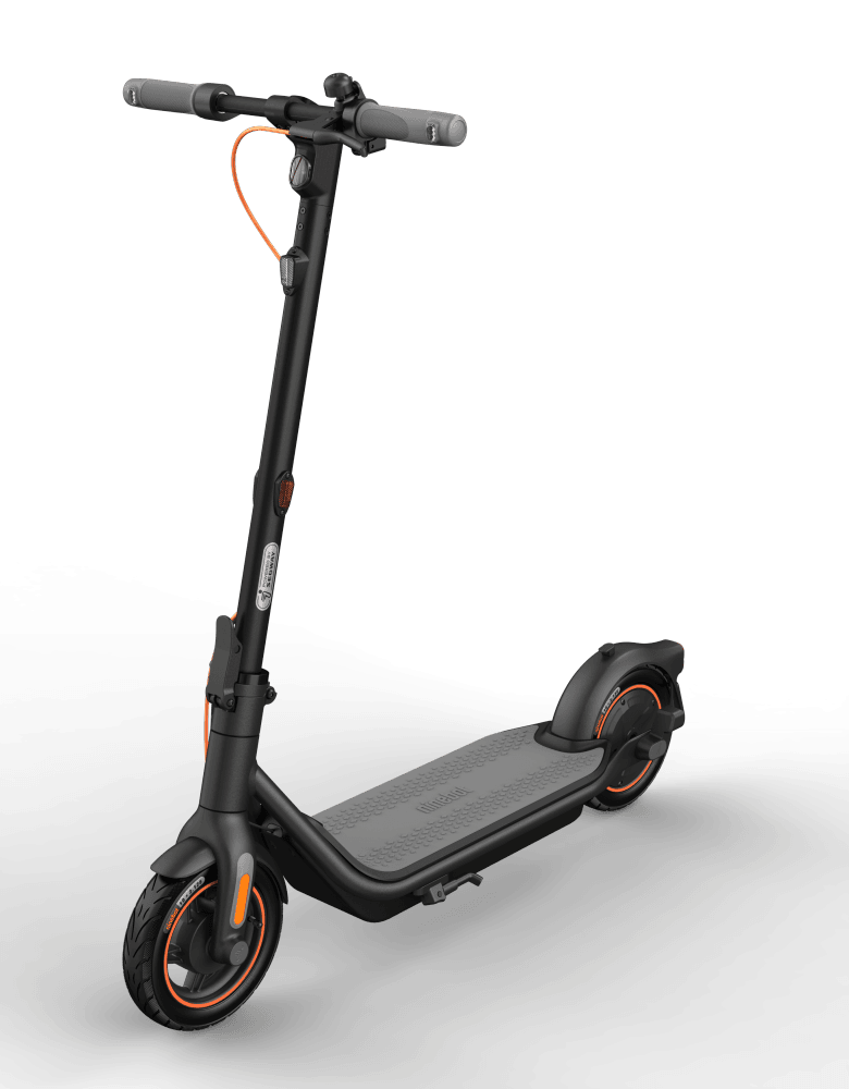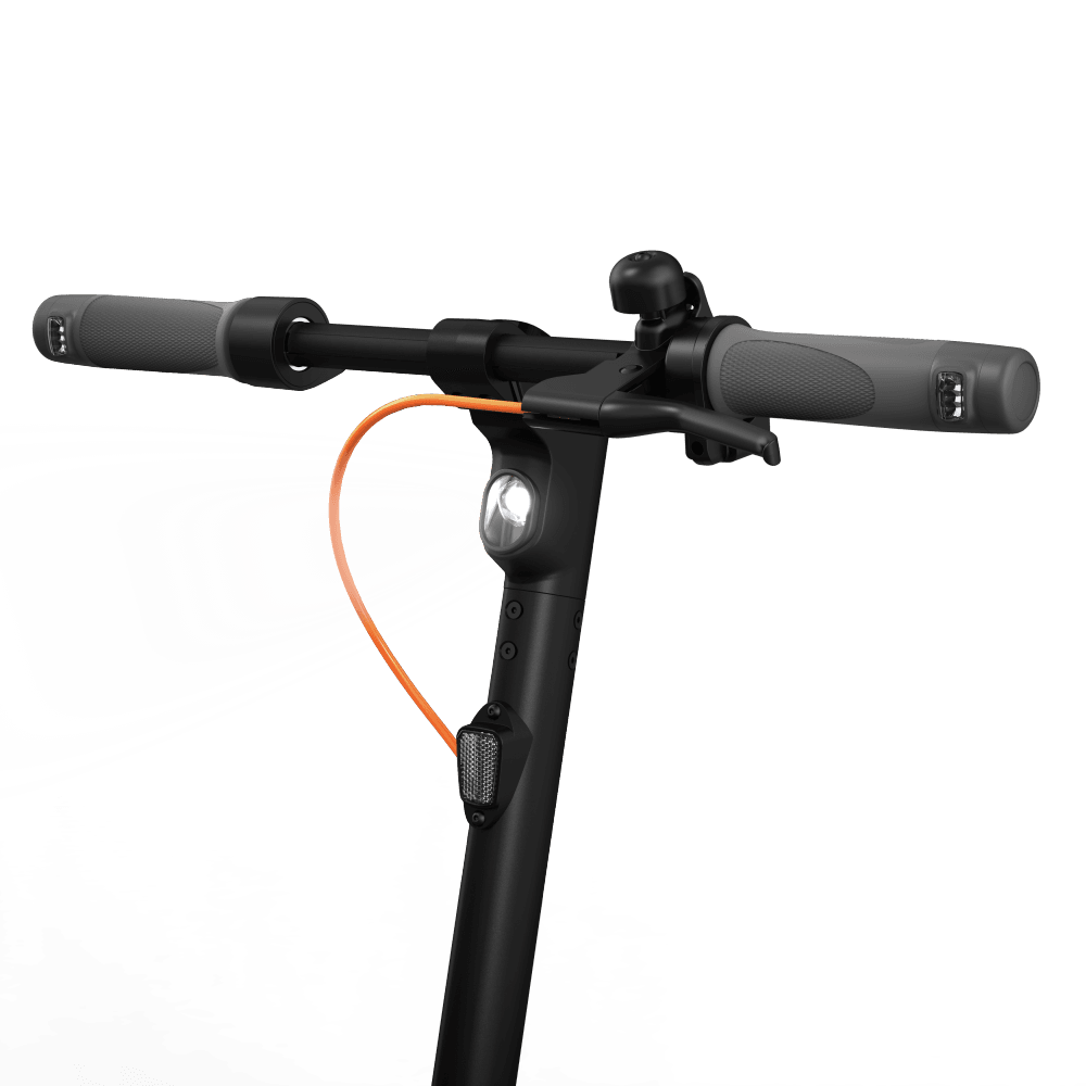 С Ninebot F65 вам больше не нужно возить с собой зарядное устройство – оно уже встроено в деку электросамоката, а его порт прикрыт надёжной резиновой заглушкой. Теперь можно зарядить батарею где угодно – дома, в офисе, у друзей – достаточно иметь с собой только лёгкий и компактный кабель, который практически не занимает места в сумке. Электросамокат оборудован комбинированной тормозной системой, которая позволяет водителю совершить быструю, но безопасную остановку: спереди установлен механический тормоз барабанного типа, а сзади – электронный тормоз с E-ABS и рекуперативной системой. Ninebot KickScooter F65 оборудован полноценными указателями поворота – передние встроены в рукоятки, а задние расположены на раме. Управление сигналами осуществляется переключателем на левой ручке, также есть индикация включенного поворотника на LED-дисплее.