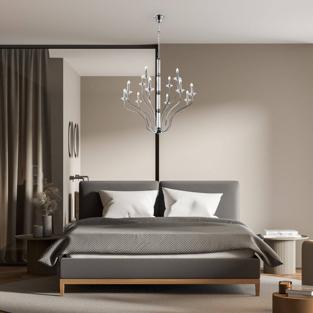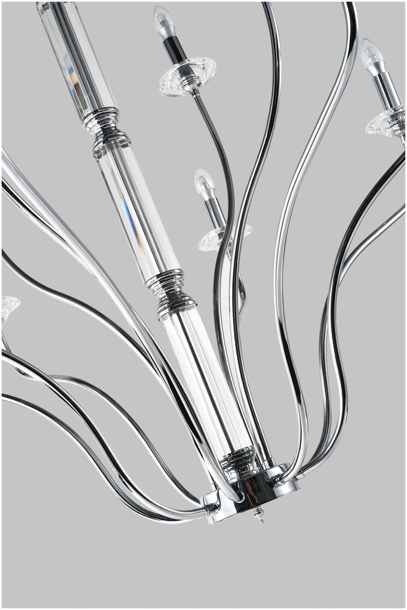 Элегантная подвесная люстра с хрустальными вставками. Простой и в тоже время изящный дизайн достигается за счет сочетания витиеватого каркаса и хрустальных вставок, которые при освещении создают изумительную игру света. Данная люстра дополнит интерьер зала, гостиной и обеденной зоны. При необходимости можно отрегулировать высоту с помощью подвесной цепи.