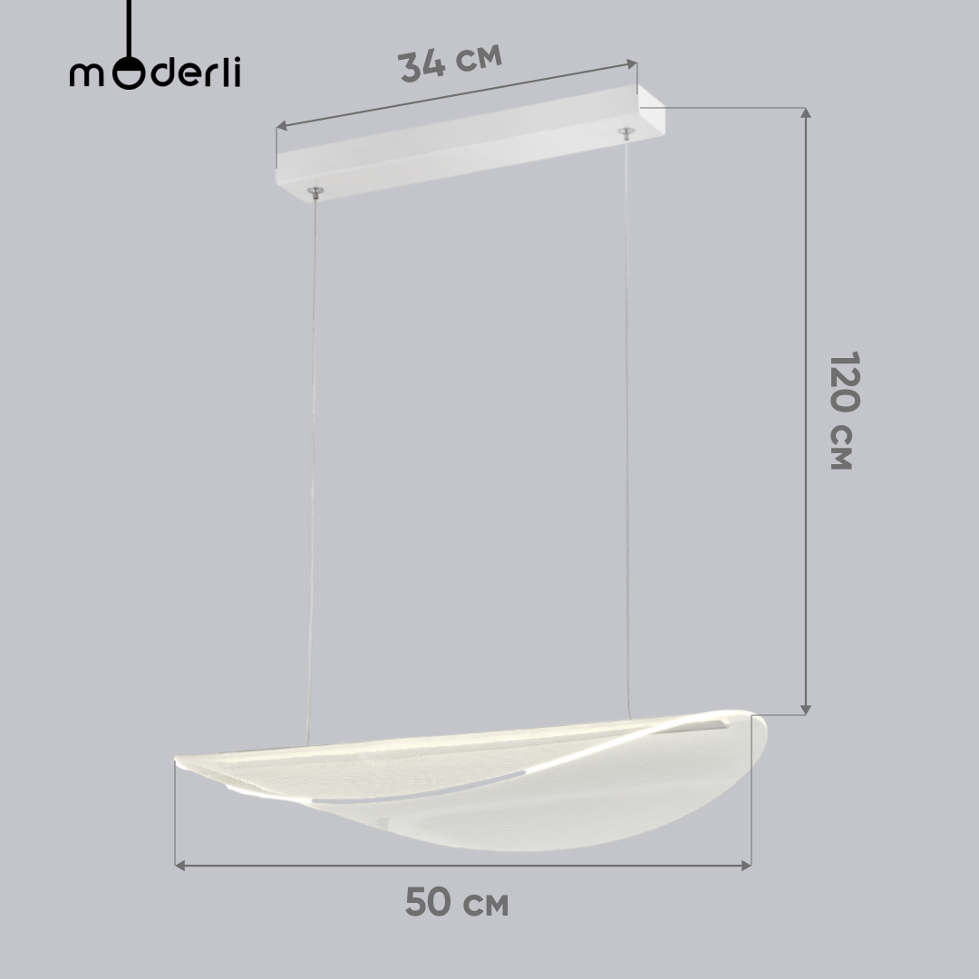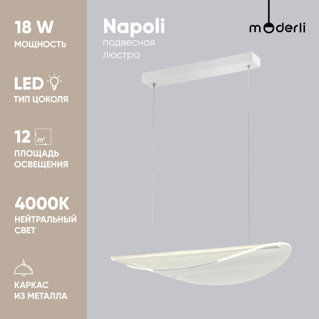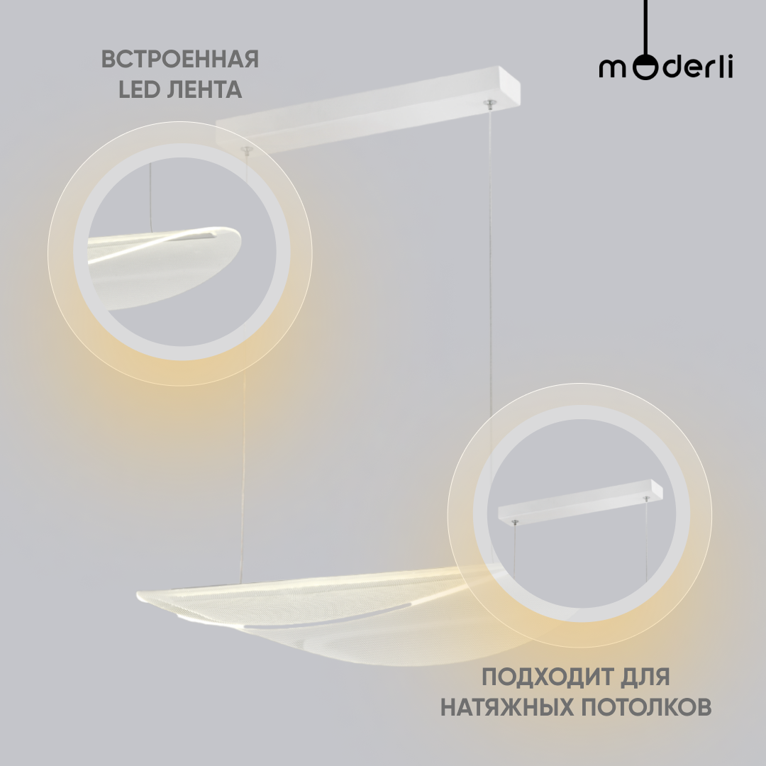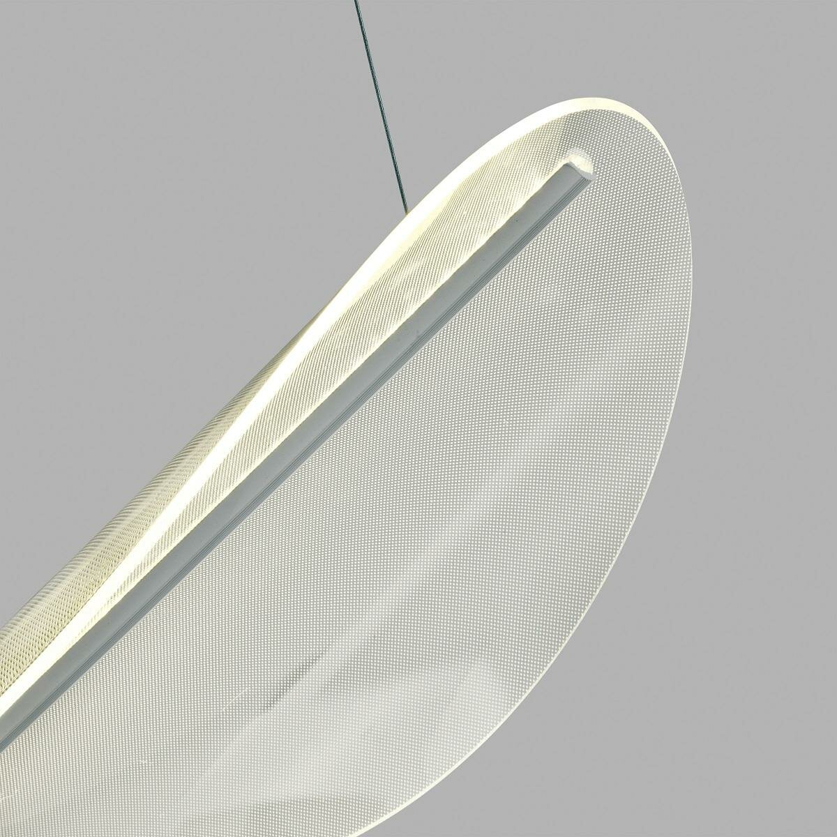 Современная подвесная люстра со светодиодной лентой. Воздушный и лаконичный дизайн достигается за счет изогнутого плафона из прозрачного акрила. Встроенная светодиодная лента мощностью 18 Вт и с цветовой температурой 4000 К создает мягкое нейтральное освещение. Люстра не нагромождает пространство и идеально дополнит современный интерьер кухни, обеденной и барной зоны.