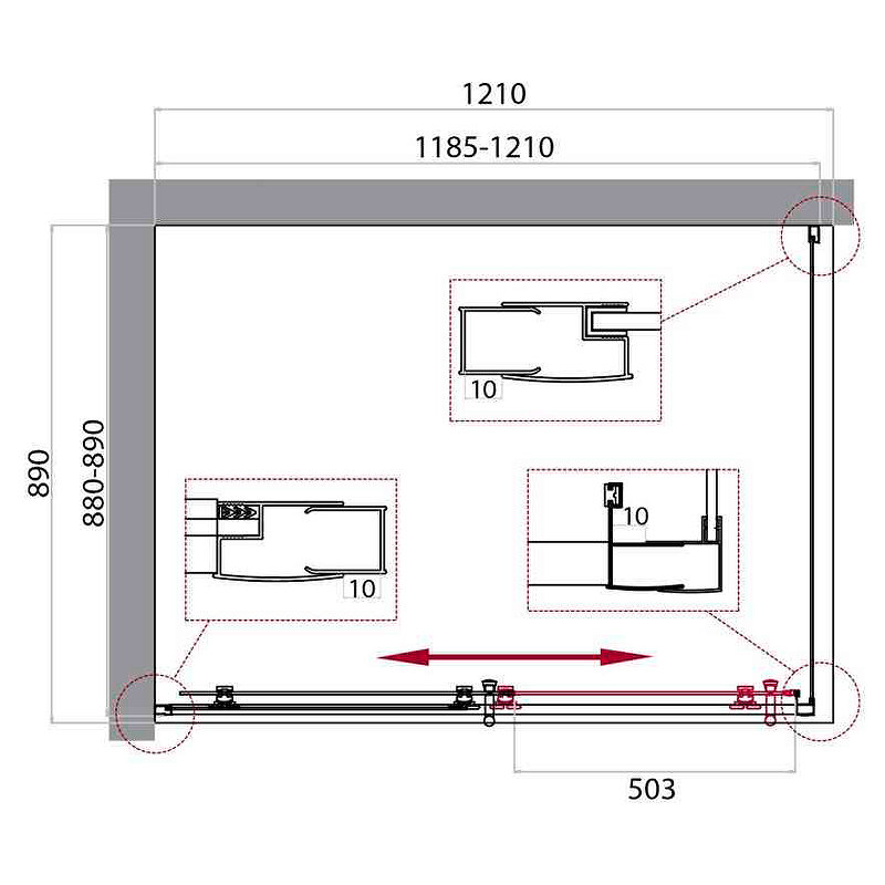 - Регулировка ширины предусмотрена за счет боковых профилей, что позволяет без проблем установить изделие даже при кривизне стен.