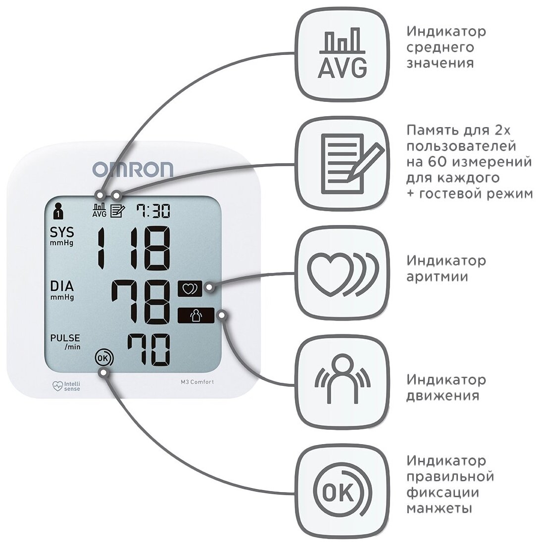 - Технология управления Intellisense интеллектуальная адаптация тонометра под каждого пользователя