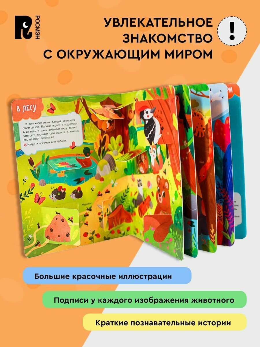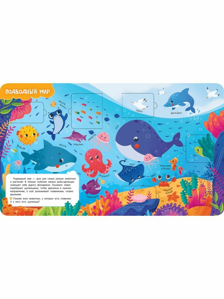 На каждом развороте яркие современные иллюстрации, небольшое задание и окошки, под которыми спрятаны интересные факты!