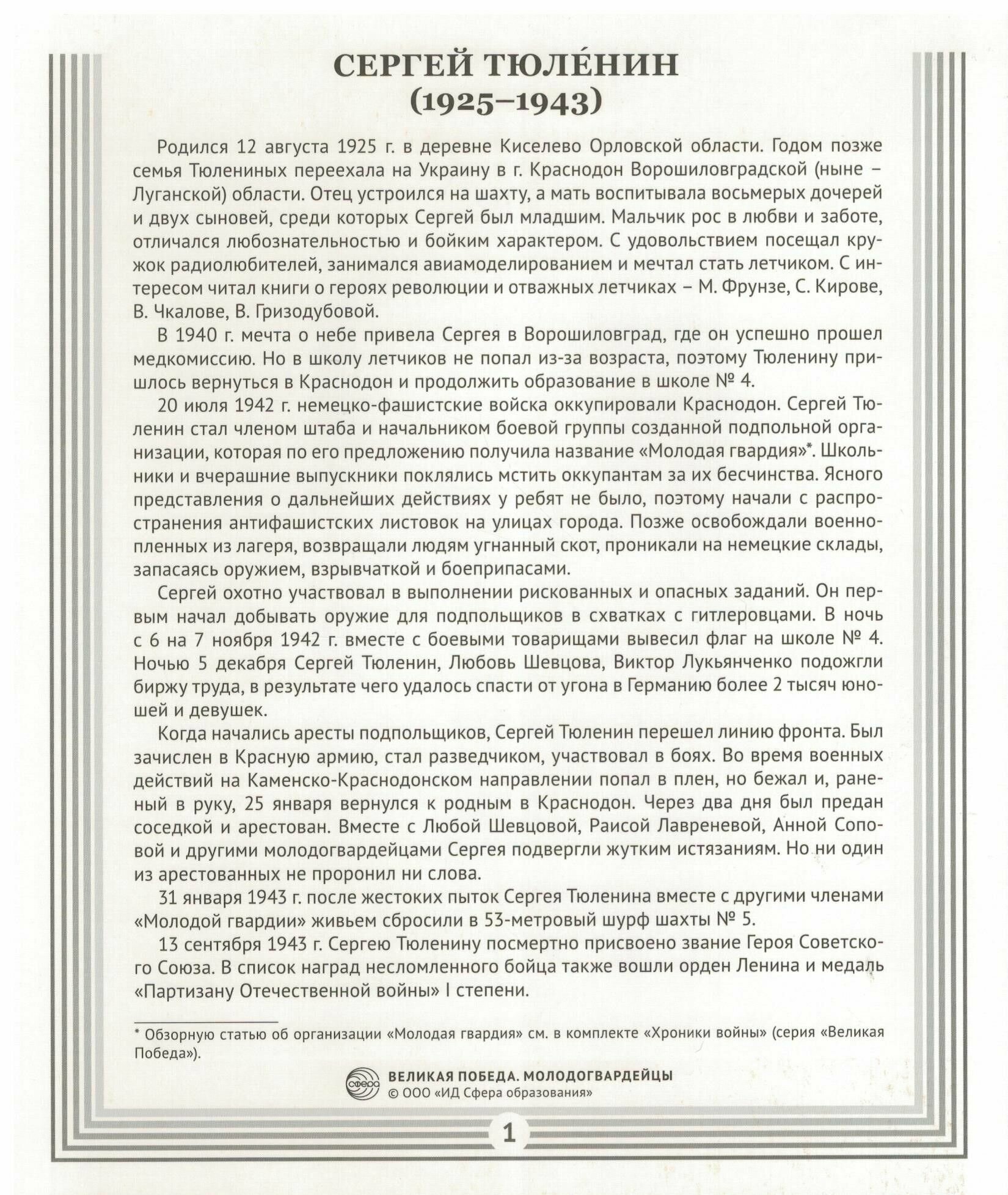 – краткие биографии молодогвардейцев;