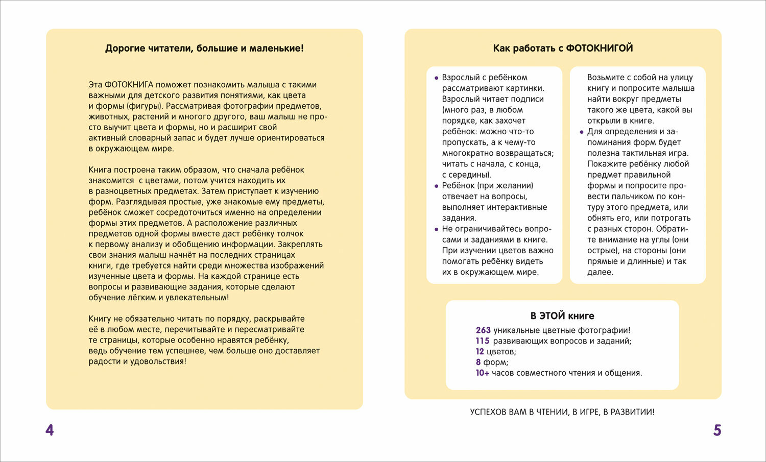 В этой яркой и интересной книге собрано более двухсот фотографий, которые познакомят ребенка с миром вокруг, покажут окружающие его предметы и при этом научат различать более десяти цветов и множество форм (не только круг, квадрат, треугольник, но и многие другие). На каждой странице ребенка ждут интересные вопросы и задания, развивающие логику, внимание, расширяющие кругозор.