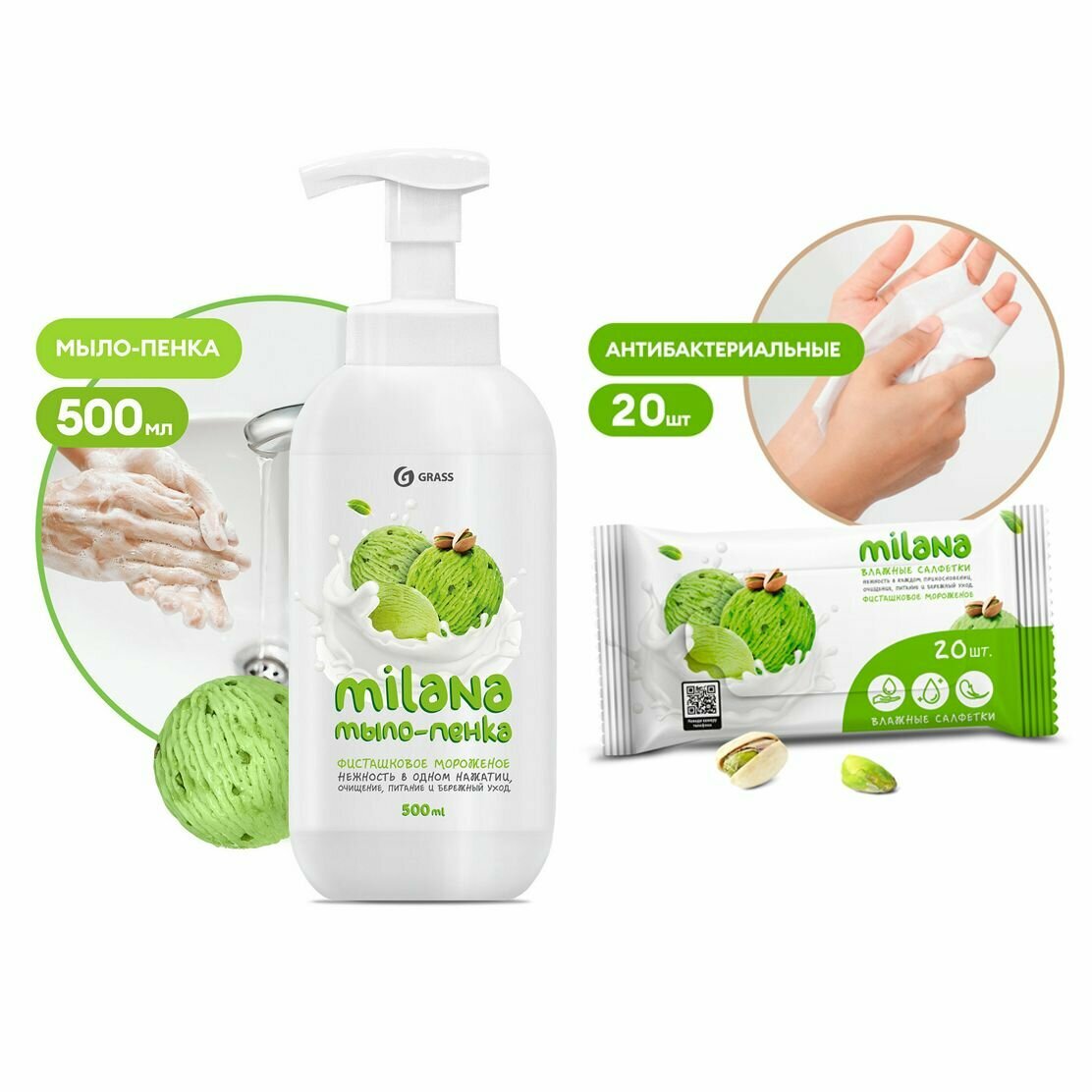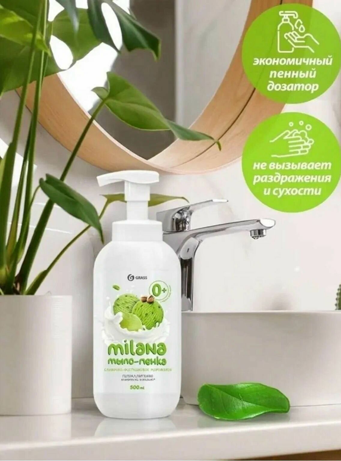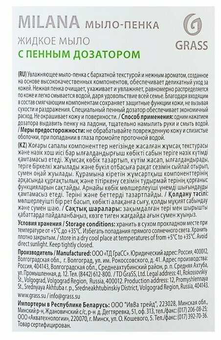 Жидкое мыло пенка для рук Milana от Grass 500 мл Фисташкое мороженое, мыло с бархатной текстурой и нежным ароматом, созданное на основе высококачественных компонентов, обеспечивает деликатный уход за кожей, оставляя после мытья на руках ощущение свежести и гладкости кожи. Также подходит, как детское жидкое мыло-пенка. Нежная пенка Милана очищает, ухаживает и увлажняет, равномерно распределяется по коже и легко смывается водой, подходит для детей, даря удовольствие всей семье. Смягчающие компоненты в составе мыла пенки сохраняют защитные функции кожи, не вызывая сухости и раздражения. Специальный пенный дозатор обеспечивает экономичный расход. Мыло пенка используется для дозатора или диспенсера. Наше мыло пена гипоаллергенное. Попробуйте всю линейку бытовой химии универсальных чистящих и моющих от Грасс : средство для мытья окон и зеркал, средство для сантехники, средство для ванной и унитаза, средство для кухни, из которой можно собрать отличный набор для уборки дома.