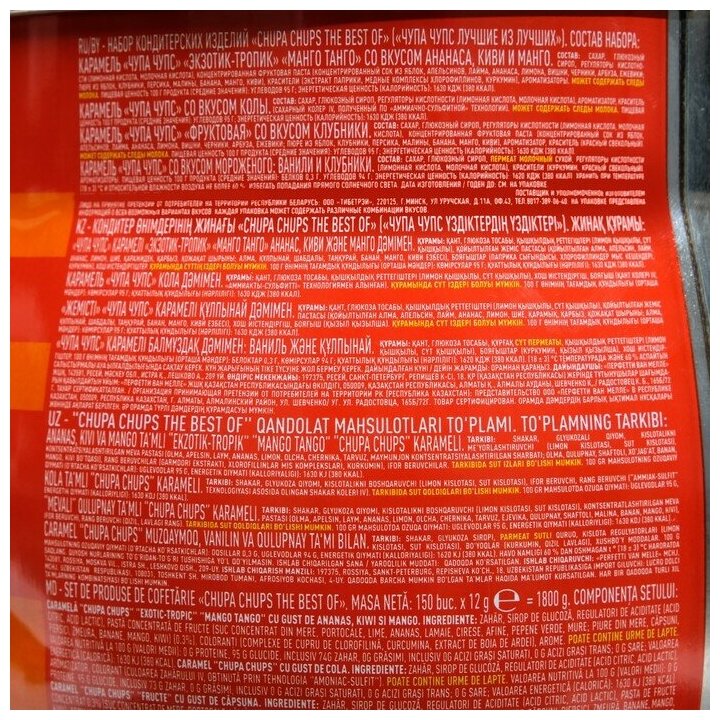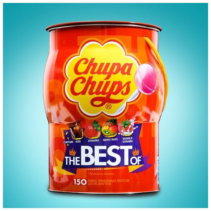 Карамель Chupa Chups The Best Of – это микс любимых вкусов в одной упаковке. Каждый вкус представлен в количестве 150 штук. В составе углеводов 95 г/100 г, белков 0,3 г/100 г и жиров – ноль. Энергетическая ценность составляет 380 ккал/100 г. Вес каждой конфеты – 12 г.Карамель Chupa Chups – это не только вкусный продукт, но и полезный. Она содержит витамины и минералы, которые помогают укрепить иммунитет и улучшить общее состояние здоровья. Кроме того, карамель Chupa Chups имеет приятный вкус и аромат, который не оставит равнодушным ни одного сладкоежку.Покупайте карамель Chupa Chups The Best Of в количестве 1 упаковки на 150 конфет. Это идеальный выбор для тех, кто хочет попробовать все вкусы Chupa Chups одновременно.
