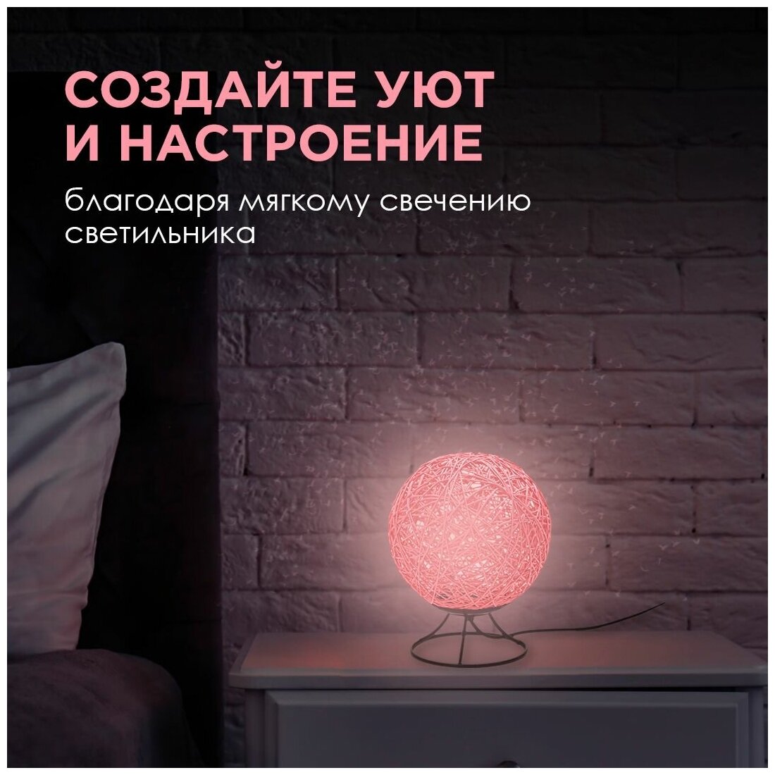 Светодиодный ночник из ротанга с ярким современным дизайном органично впишется в любой интерьер, наполнит помещение мягким светом и создаст уютную атмосферу. Под плетёным абажуром из ротанговой нити скрываются 6 светодиодов, дающие световой поток 200 Лм. Цвет свечения - теплый белый. Светильник относится к высшему классу энергоэффективности A++, мощность 3 Вт. Длина сетевого шнура составляет 1,6 м, а расположенный на шнуре выключатель обеспечивает удобное управление. Ночник имеет компактные размеры 15 х 15 х 18 см и поместится на любом прикроватном столике или тумбе. Цвет абажура - розовый. Всего в линейке представлены шесть цветовых вариантов (розовый, голубой, фиолетовый, зелёный, бежевый, белый), а это значит, что вы обязательно подберёте ночник, идеально гармонирующий с вашим интерьером. Несмотря на замысловатую форму плафона, светильник прост в уходе и легко чистится обычной метёлочкой для пыли.