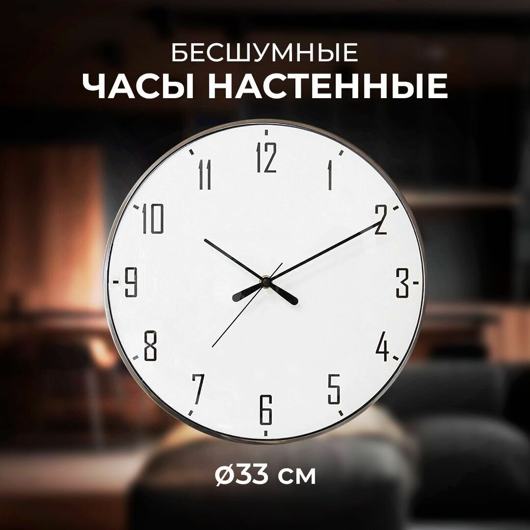 Часы настенные, круглые, золотой, металл ?33см Настенные часы с артикулом изготовлены в форме круга, который является символом бесконечности и совершенства. Данная модель представляет собой часы с корпусом из металла в стиле Hi-Tech. Отлично дополнят помещение с современным дизайном. Лицевая сторона часов защищена минеральным стеклом. На циферблате белого цвета расположены арабские цифры и три стрелки. Часы сохранят тишину в помещении благодаря использованию бесшумного механизма плавного хода. Преимущества: - Металлический корпус. - Бесшумный механизм. - Редкая замена батареек благодаря экономичному механизму. Размеры часов (ВхШхГ): 33x33x4.5 см. Тип питания: 1 батарейка типа 'АА'. Обращаем Ваше внимание, что элемент питания не идет в комплекте.