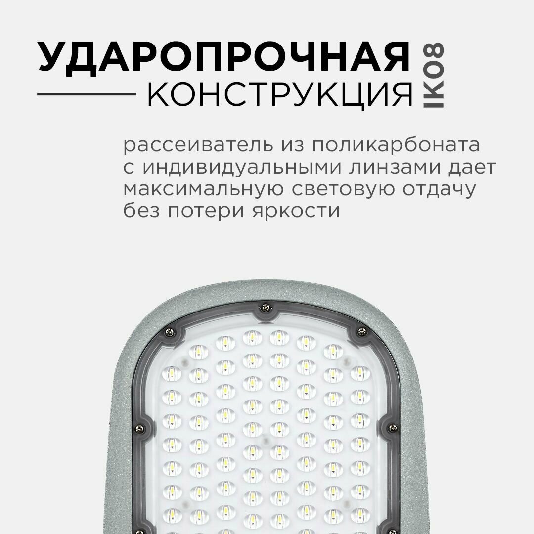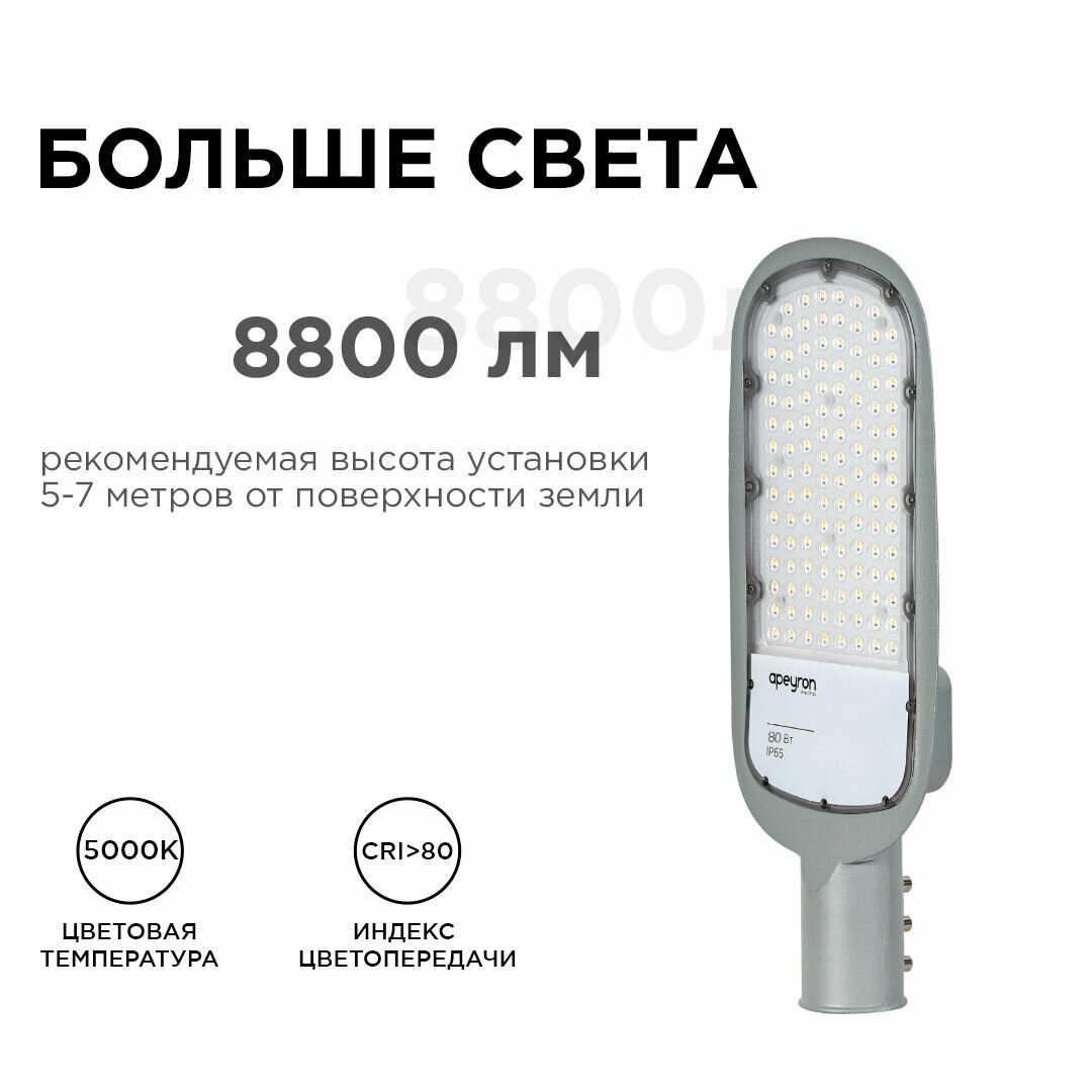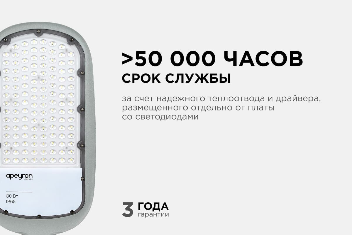 Консольный светодиодный светильник 29-03 излучает световой поток в 8800 Лм, потребляя при этом 80 Вт, что является эквивалентом лампы ДРЛ 350 Вт. Он отлично подойдет для освещения второстепенных дорог класса B и C, парковок, площадей, ж/д платформ, автозаправочных станций. Рекомендуемая высота установки 5-7 метров от поверхности земли. В светильнике используются светодиоды с дневным белым цветом свечения и цветовой температурой 5000 К, которая близка к естественному солнечному свету и наиболее комфортна для глаз. Корпус светильника имеет мощные ребра охлаждения, изготовлен из алюминиевого сплава с размерами 495х215х80мм. Рассеиватель изготовлен из поликарбоната, устойчивого к воздействию температур и солнечному свету, сохранит свою прозрачность и качество на протяжении всего срока службы. Благодаря линзам на рассеивателе, которые установлены напротив каждого светодиода, светильник имеет кривую силы света Ш и рассеивает световой поток под углом 140°/70°. Обеспечивает равномерное широкое освещение дорожного полотна с захватом тротуаров. В светильнике используется драйвер, который имеет дополнительную защиту от пыли и влаги, а также защиту от скачков напряжения, что обеспечит стабильное освещение даже при скачках напряжения в сети в диапазоне 85-265 В. Благодаря тому, что драйвер размещен отдельно от платы со светодиодами, а корпус светильника хорошо отводит тепло, освещение будет радовать долгие годы. Светильник предназначен для установки на кронштейн с посадочным диаметром O50-60 мм. Преимущества: - Полная защита от проникновения пыли, влаги и механических повреждений; - Высокая ветроустойчивость и защита от обледенения; - Широкое распределение светового потока по дорожному полотну; - Световая отдача 110 Лм/Вт; - Защита от импульсных помех; - Высокоэффективный изолированный драйвер с коэффициентом мощности PF>0,95.