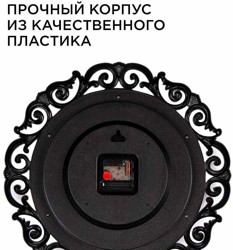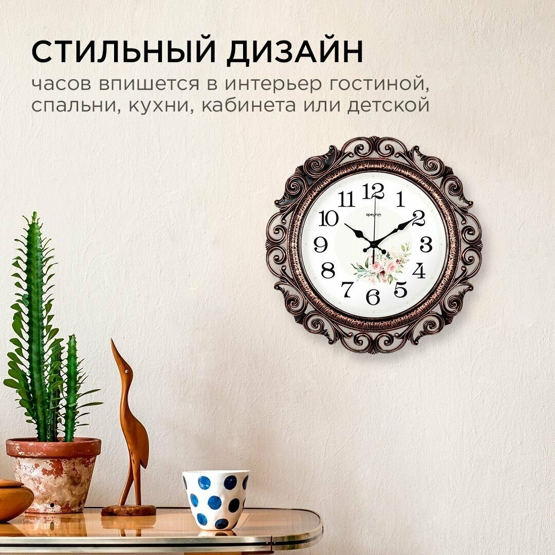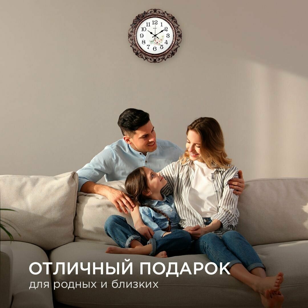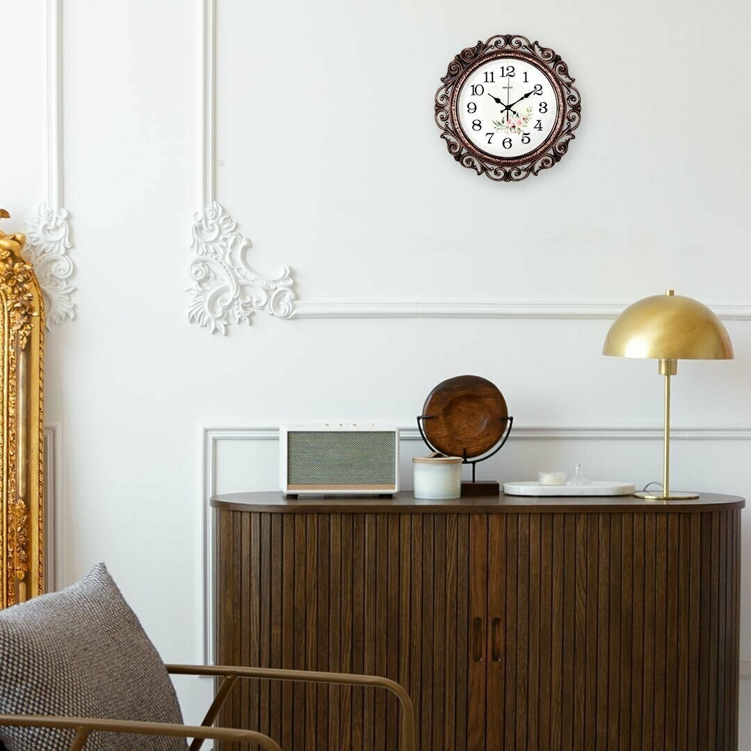 Настенные часы с артикулом изготовлены в форме круга с размерами O405*40 мм. Данная модель представляет собой часы с корпусом из качественного пластика. Лицевая сторона часов защищена минеральным стеклом. На циферблате белого цвета расположены арабские цифры и три стрелки. Цвет корпуса бронза. Часы сохранят тишину в помещении благодаря использованию бесшумного механизма плавного хода, который работает от батарейки стандарта АА (не входит в комплект). Преимущества: - Корпус из качественного пластика. - Бесшумный механизм. - Редкая замена батареек благодаря экономичному механизму.