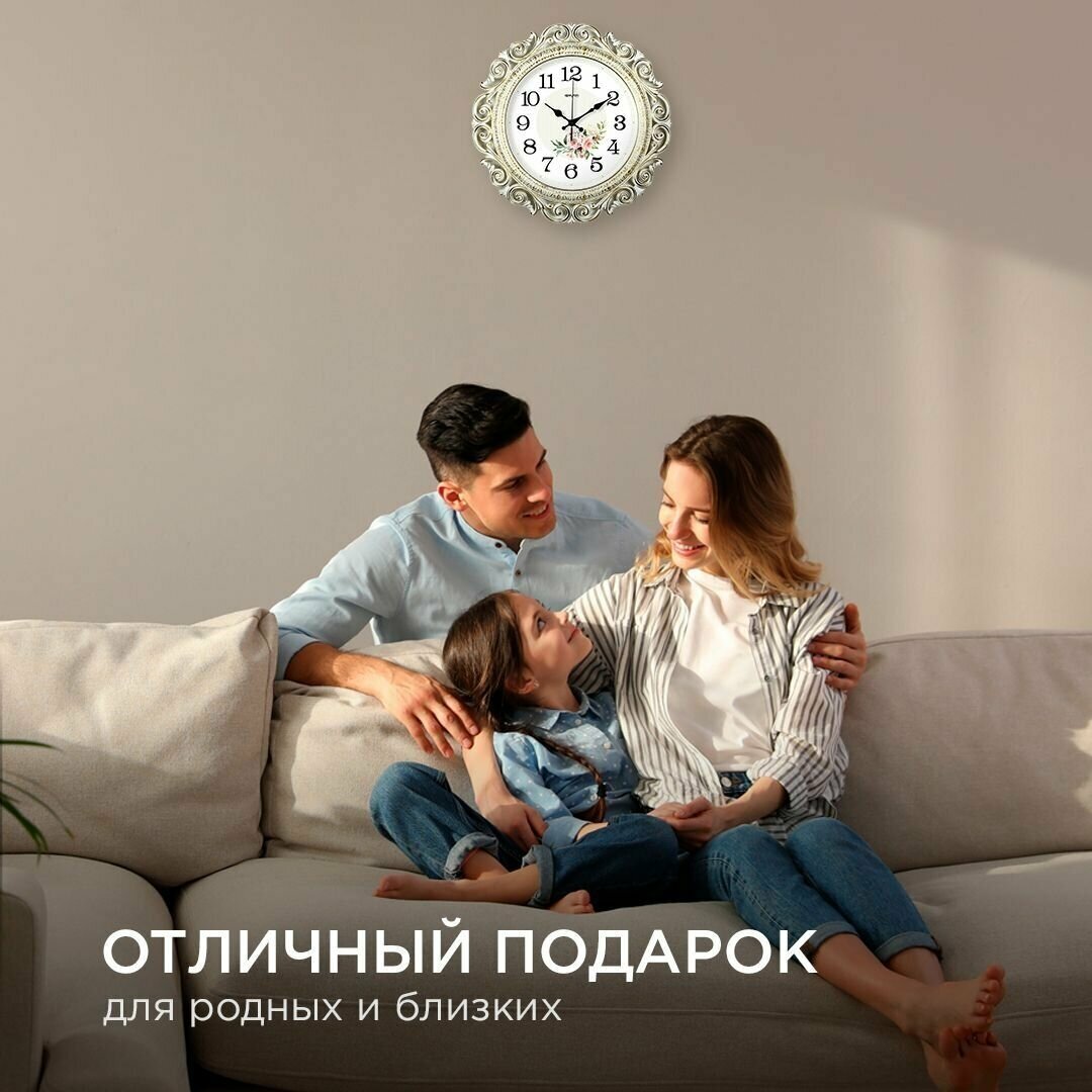 Настенные часы с артикулом изготовлены в форме круга с размерами O405*40 мм. Данная модель представляет собой часы с корпусом из качественного пластика. Лицевая сторона часов защищена минеральным стеклом. На циферблате белого цвета расположены арабские цифры и три стрелки. Цвет корпуса золотая патина. Часы сохранят тишину в помещении благодаря использованию бесшумного механизма плавного хода, который работает от батарейки стандарта АА (не входит в комплект). Преимущества: - Корпус из качественного пластика. - Бесшумный механизм. - Редкая замена батареек благодаря экономичному механизму.