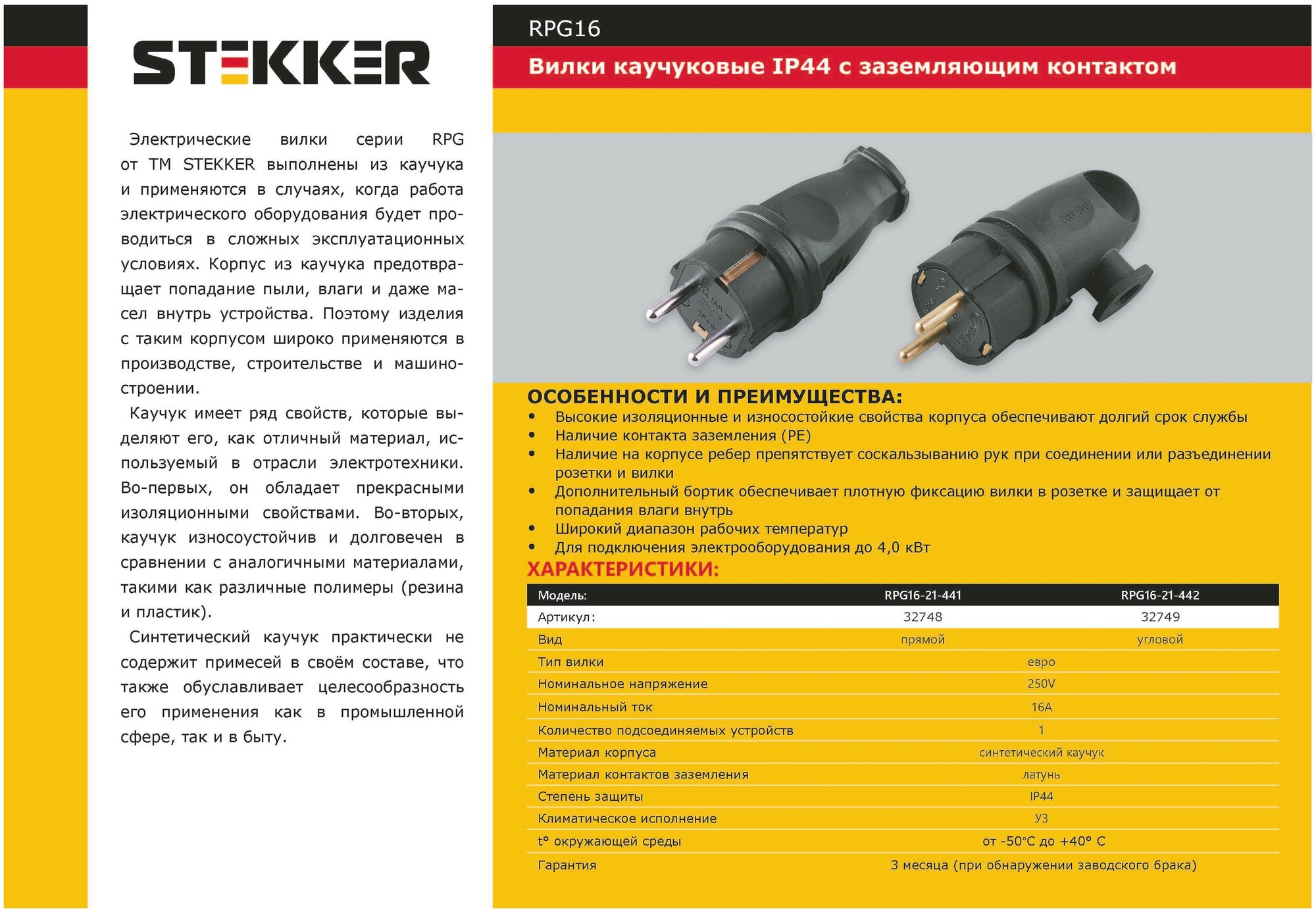 Каучуковые вилки Stekker предназначены для использования в сложных эксплуатационных условиях и широко применяются в производстве, строительстве и машиностроении. Вилки предназначены для подключения приборов к сети напряжением 250В. Они легко монтируются, имеют высокую надежность и долгий срок службы. Наличие на корпусе ребер препятствует соскальзыванию рук при соединении или разъединении розетки и вилки. Дополнительный бортик обеспечивает плотную фиксацию вилки в розетке и защищает от попадания влаги внутрь. Заземление: да Материал корпуса: каучук Максимальный ток: 16 А Степень защиты: IP44 Гарантия: 1 год Производство: Китай