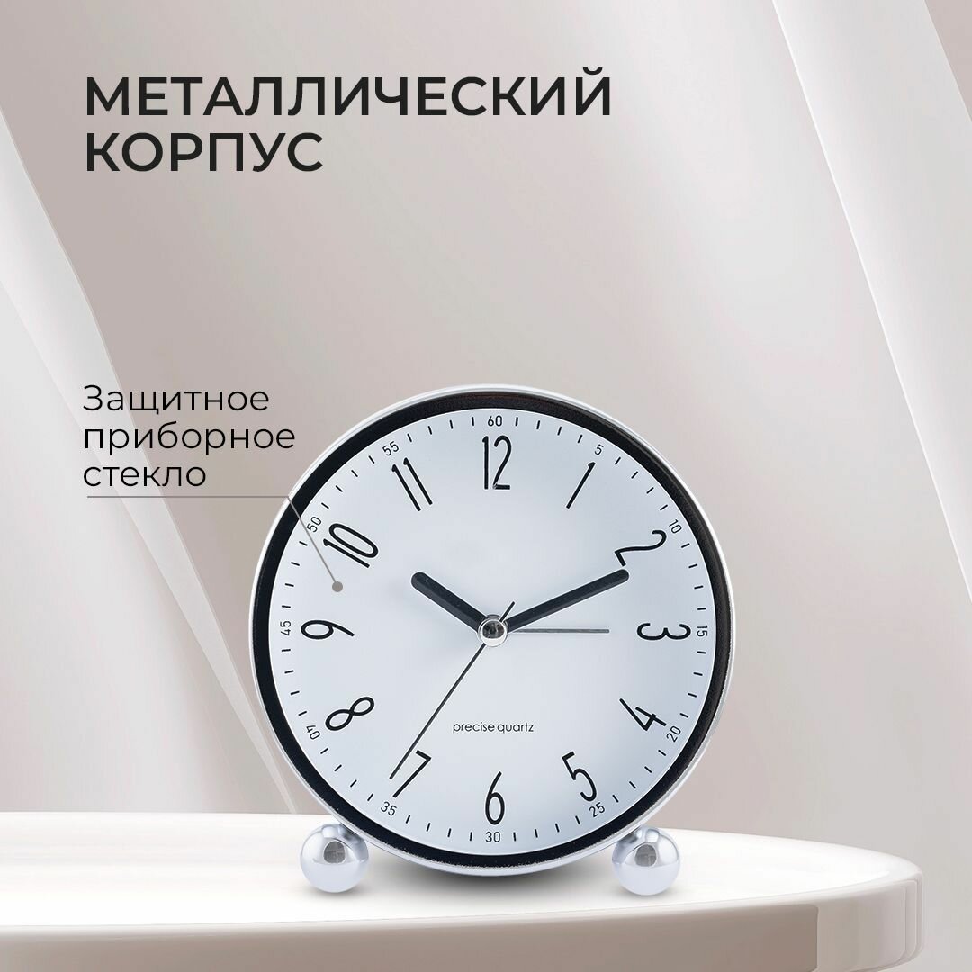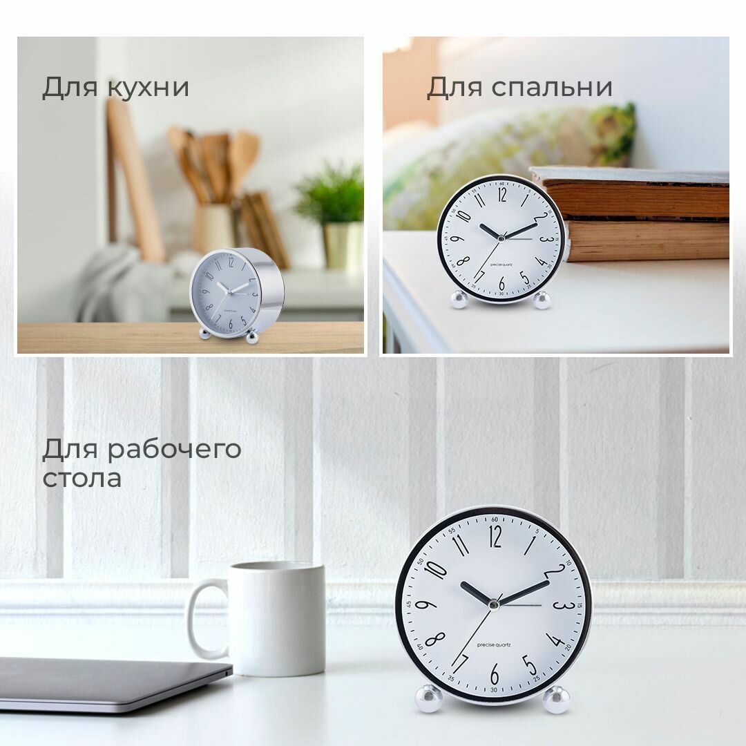 Настольные часы будильник Apeyron MLT2207-519-4 изготовлены в форме круга с размерами Ø115*55 мм.Будильник с подсветкой представляет собой часы с корпусом из металла в стиле Hi-Tech. Часы настольные отлично дополнят помещение с современным дизайном.Лицевая сторона будильника на батарейках защищена минеральным стеклом. Особенностью будильника настольного механического является наличие подсветки. На циферблате расположены арабские цифры и четыре стрелки.Часы с будильником сохраняют тишину в помещении благодаря использованию бесшумного механизма плавного хода, который работает от батарейки стандарта АА (не входит в комплект).Часы ищут также как: будильник громкий, будильник механический, часы настольные механические, часы бесшумные, настольные часы с будильником, ретро часы настольные, часы классика, будильник бесшумный, настольные часы кварцевые, часы настольные круглые, часы круглые, настольные часы, часы apeyron, будильник, световой будильник, будильник с подсветкой, часы с подсветкой, часы с лампочкой, часы металлические.Преимущества:- Металлический корпус;- Бесшумный механизм;- Редкая замена батареек благодаря экономичному механизму;- Часы с функцией будильника;- Наличие подсветки.