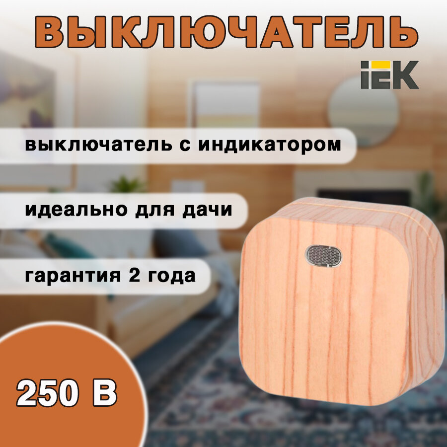 Выключатель IEK GLORY 1кл. индикатор/подсветка открытый монтаж в сборе сосна (EVH11-K34-10) EVH11-K34-10 Glory сосна