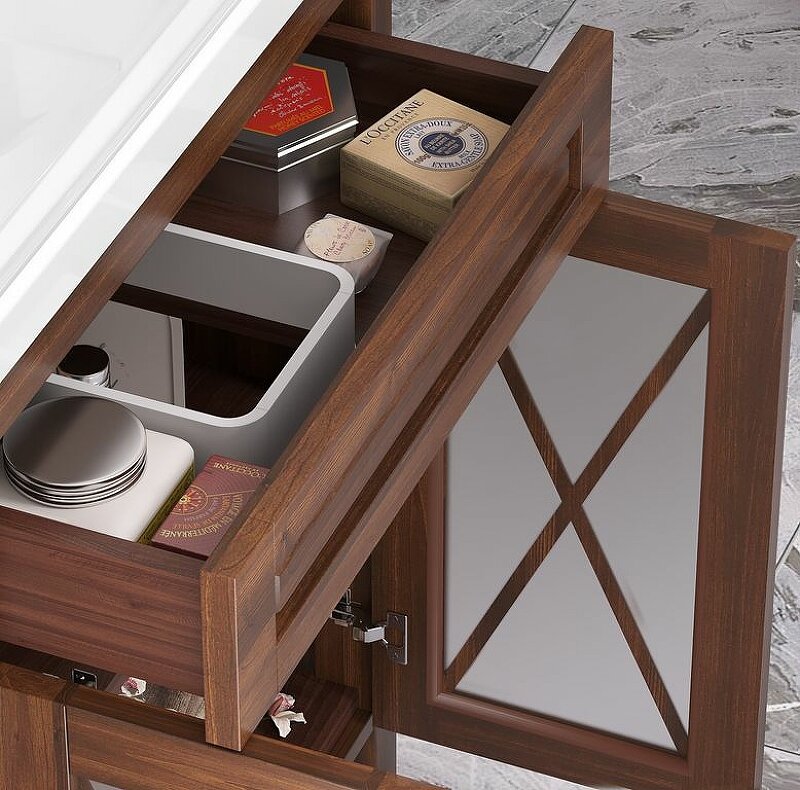 - Оснащение: дверцы с доводчиками (плавное закрывание), ящик с системой открывания от нажатия Push-to-Open.