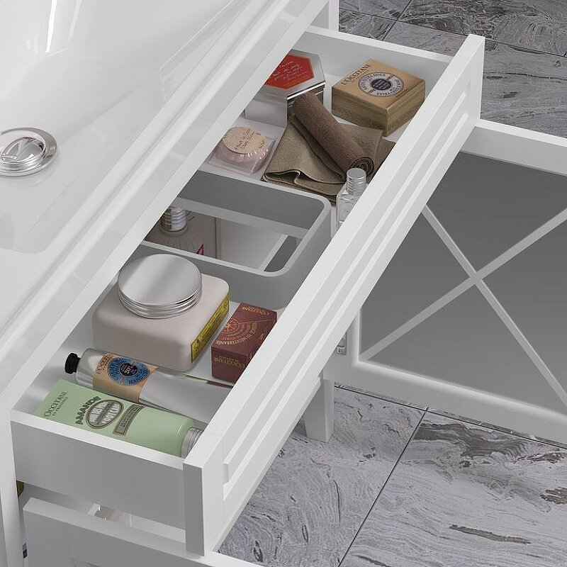 - Оснащение: дверцы с доводчиками (плавное закрывание), ящик с системой открывания от нажатия Push-to-Open.
