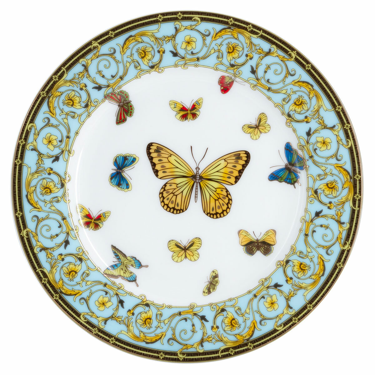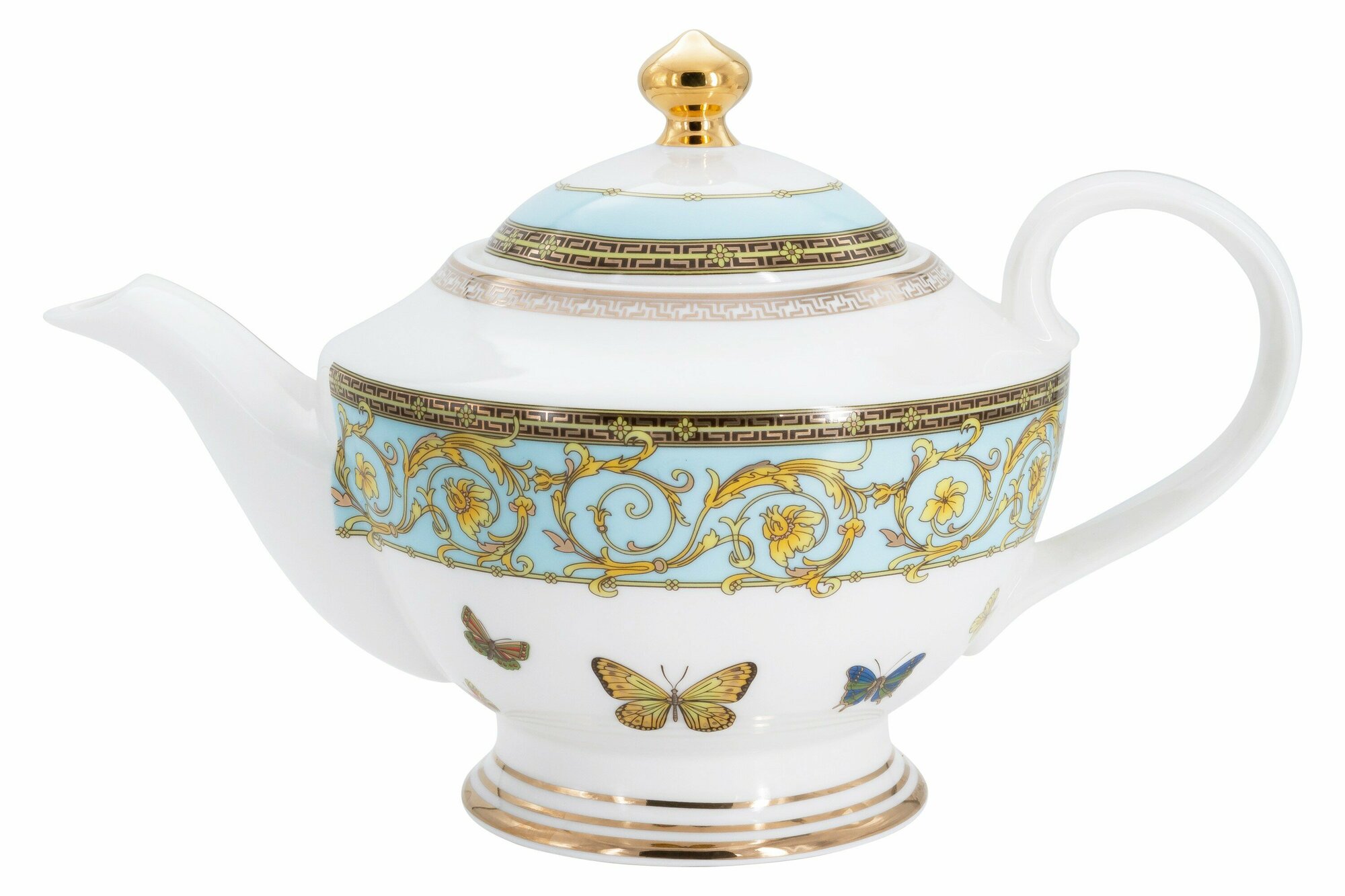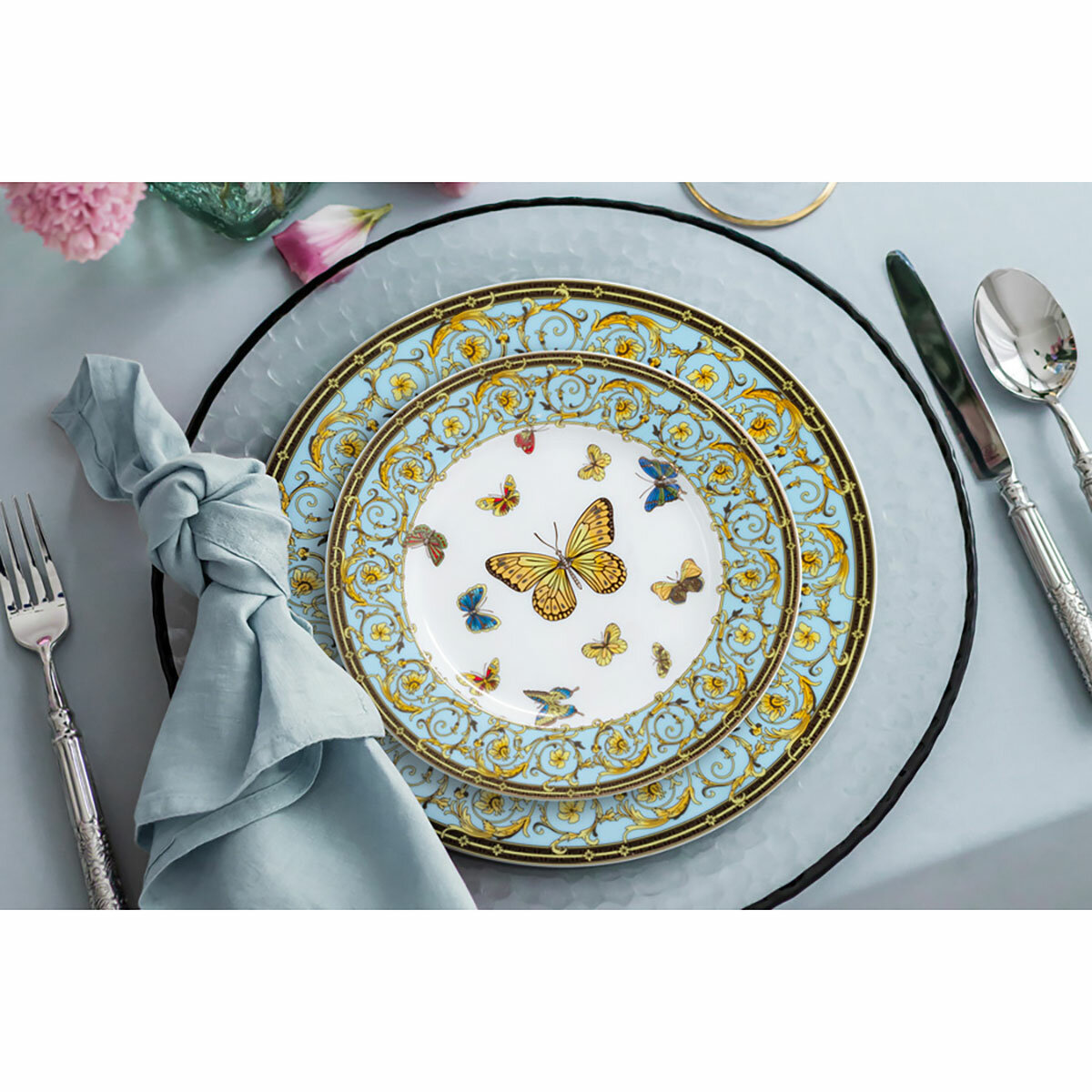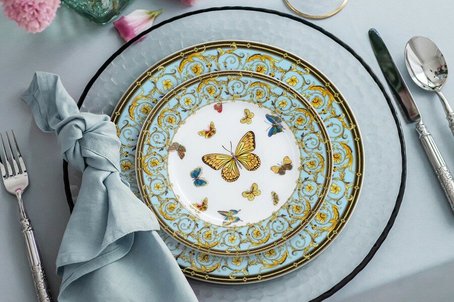Яркие разноцветные бабочки на белом фарфоре, жёлтые цветы и листья по краю, создающие красивый узор, идеально сочетаются с голубым цветом и орнаментом золотого цвета. Эта коллекция, безусловно, станет украшением Вашего интерьера или прекрасным подарком для Ваших друзей и близких.