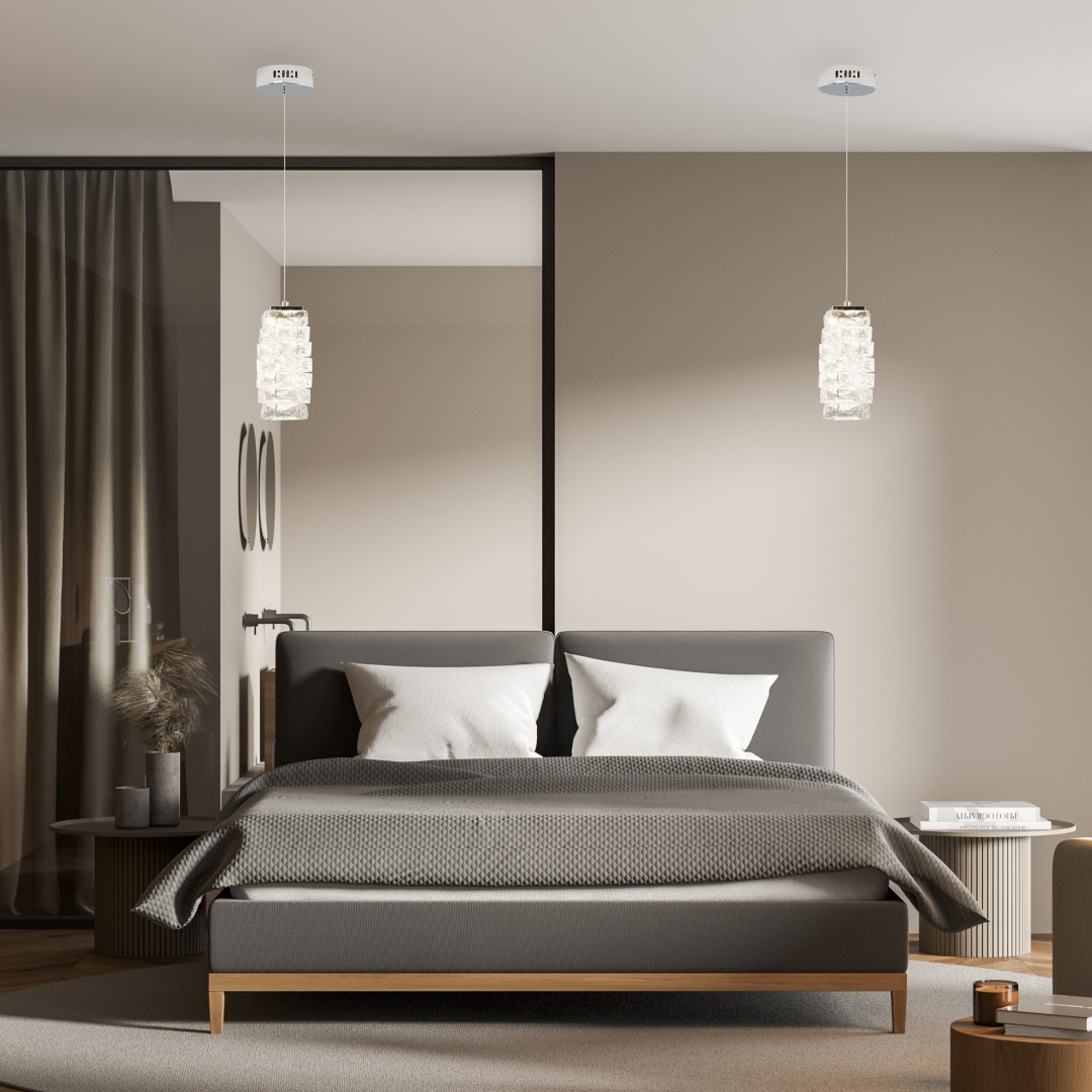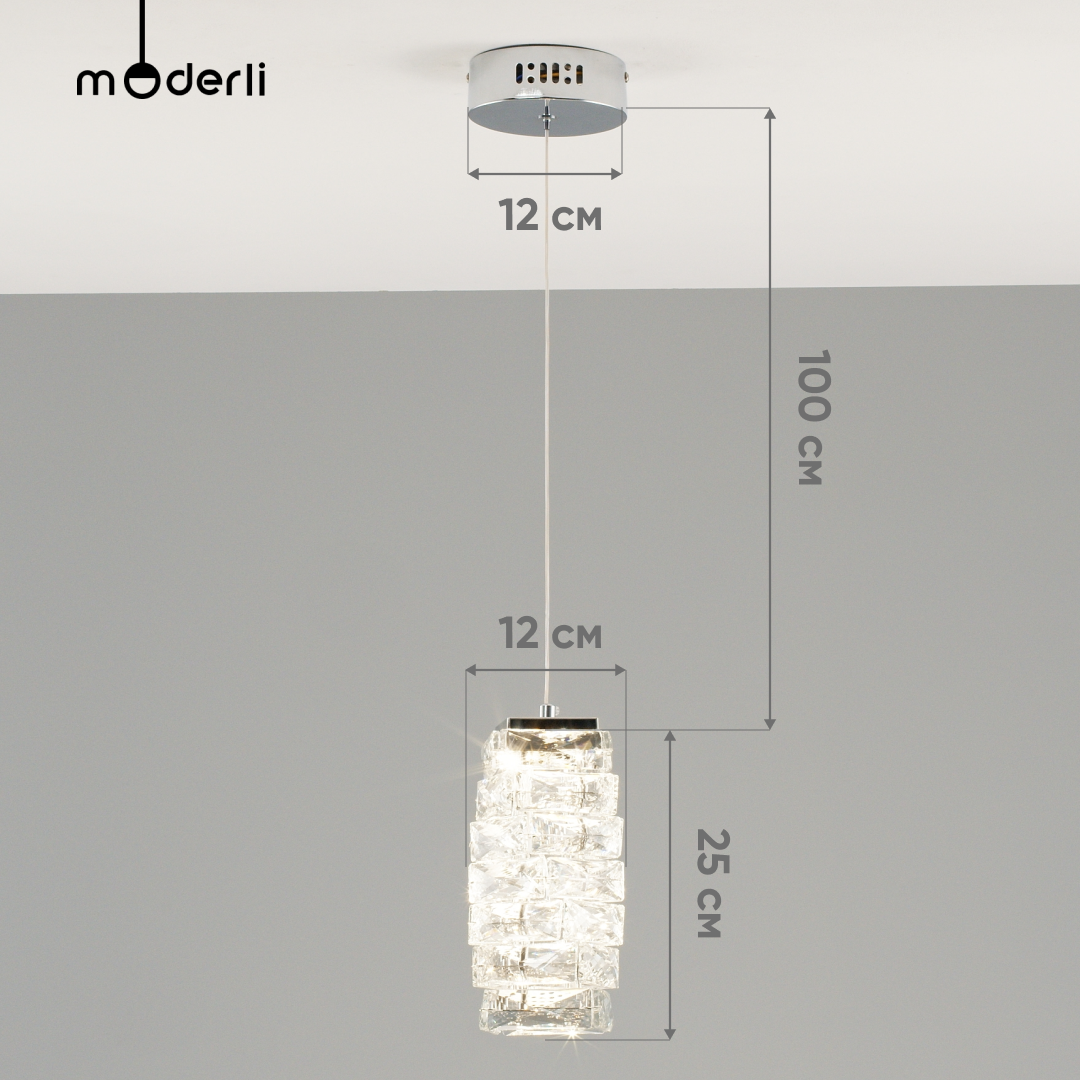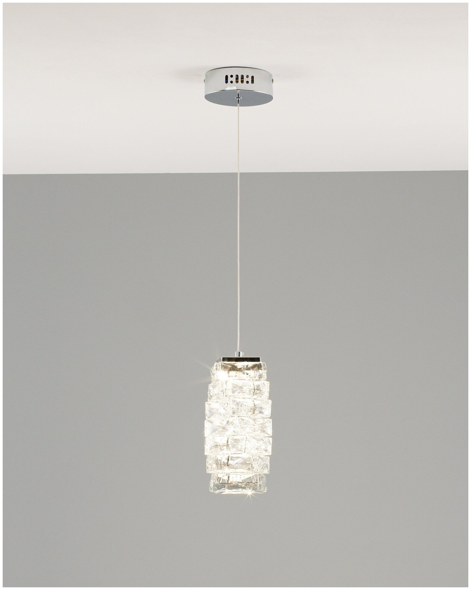 Лаконичный подвесной светильник с плафоном из прозрачного хрусталя. Граненные края плафона создают изумительную игру света при освещении. Минималистичный дизайн светильника дополнит интерьер кухни, прихожей, идеально смотрится в комплекте из нескольких штук и подойдет для освещения баров и кафе. В качестве источника света используются встроенные светодиоды общей мощностью 10 Вт. При необходимости высоту плафона можно отрегулировать при монтаже.