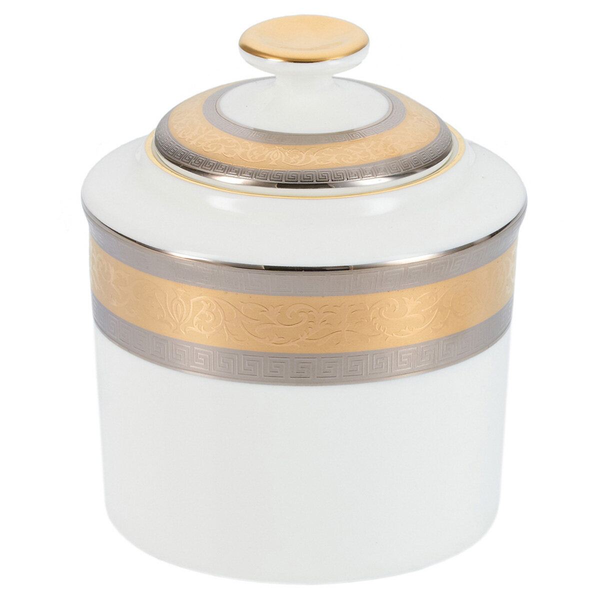 Сахарница HERMES. Диаметр сахарницы 10 см. Изготовлена из костяного фарфора, легкого и экологически чистого материала. Предметы сервировки HERMES отличаются изысканным дизайном, а присутствие серебряного и золотого канта придают ощущение роскоши и богатства убранства. Данная посуда отлично подойдет как для семейного обеда, так и для сервировки стола при приеме гостей. При сервировке сочетаются с другой посудой коллекции HERMES. Упакованы в фирменную коробку.