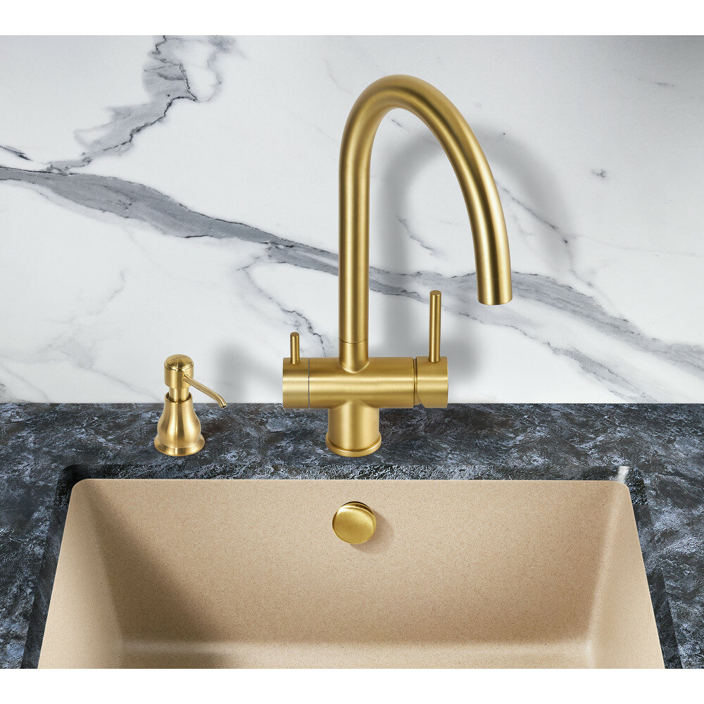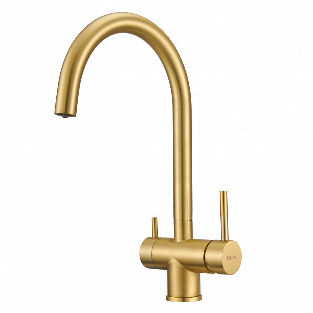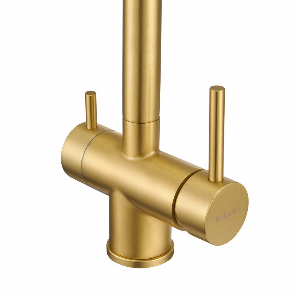 - Возможность подключения фильтра обеспечивает легкий доступ к чистой питьевой воде и избавляет от необходимости установки дополнительного крана, сохраняя цельность и эстетику пространства. Для подачи фильтрованной воды предусмотрен отдельный рычаг регулировки.