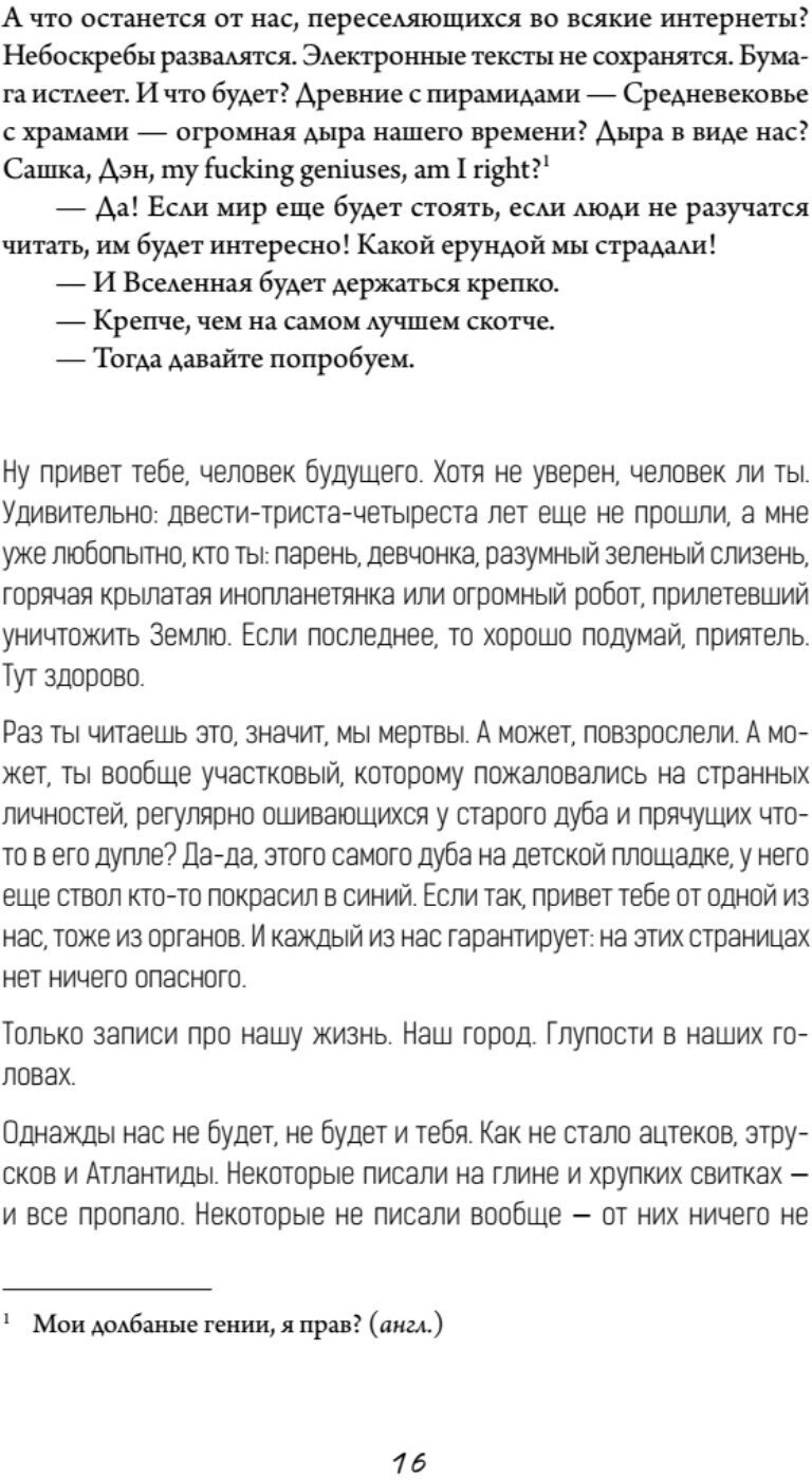 Перед вами - современное фэнтези. Год действия - 2007, у многих на этом моменте уже проснется интерес. Могут отпугнуть размеры книги, но быстро раскрывшиеся и заинтересовавшие герои с первых страниц заставляют читать дальше. Сюжет строится на группе друзей, которые захотели завести общий дневник, который после они надежно спрячут для будущих людей или других живых веществ, если они обретут интеллект, поскольку рассчитывают ребята на столетия. Их беспокоит мысль о том, что конкретно о нашем современном мире ничего не останется, ни бумаг, ни громадных построек, как раньше, а им очень не хочется быть дырой в истории человечества. И на следующих страницах книги и развернется их дневник, в котором буду описаны наши герой самими собой или своими друзьями, их взаимоотношения, их индивидуальный кризисы, войны, которые они ведут внутри себя, все это лично отзовется читателям. Моменты "дневника" в книге, помеченные автором - одним из компании, это как личный честный разговор конкретно с этим героем, где будто бы нет даже автора книги, что очень сближает. Но не спешите разочаровываться, с вопросом "А где фэнтези?". Еще до знакомства с ребятами, читателя встретил "Пролог Посмертья", где мы наблюдаем двух.. демонов.. и самого Лорда мертвого мира, которые с самого начала намекают нам на череду недобрых ситуаций на земле по их вене, но решать это придется людям, пешкам.. Позже на страницах дневника восьмерых друзей развернутся события ужасающих смертей, а точнее убийств. И книга начнет приобретать шлейф некого детектива, только с паранормальными явлениями. Книга написана современным языком с очень знакомыми нам шутками и сленговыми словами, иногда матом ("18+" присутствует), что тоже роднит нас с сюжетом и приобщает к книге еще больше.