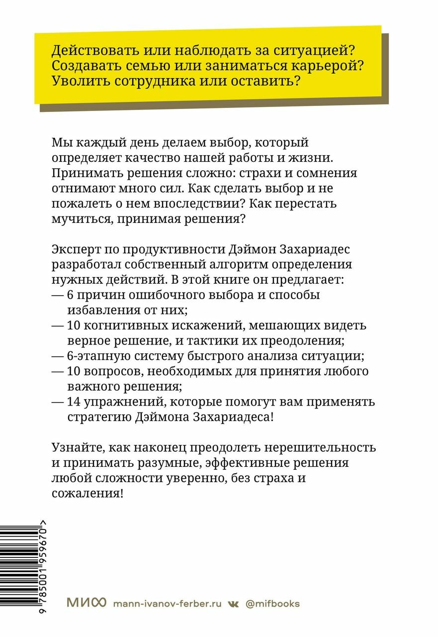 Мы каждый день делаем выбор, который определяет качество нашей работы и жизни. Принимать решения сложно: страхи и сомнения отнимают много сил. Как сделать выбор и не пожалеть о нем впоследствии? Как перестать мучиться, принимая решения?