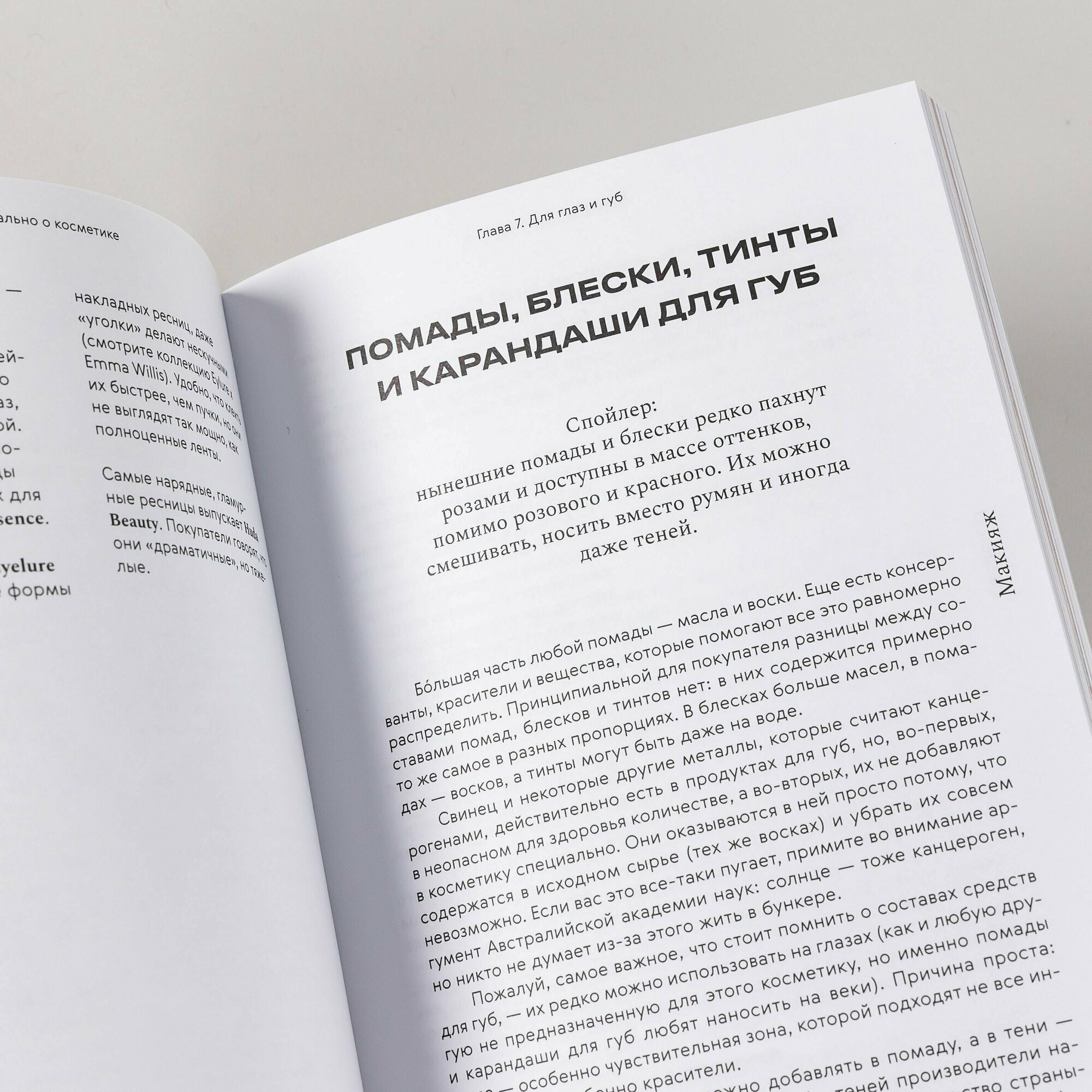 Книга состоит из двух частей: одна — об уходовой косметике, другая — о декоративной. Опираясь на свой личный и профессиональный опыт, а также на научные исследования, авторы делятся самым важным и полезным в повседневной жизни. Бьюти-блогер и создательница бренда Don’t Touch My Skin Адэль Мифтахова объясняет, зачем вообще нужна уходовая косметика, как подбирать средства для своего типа кожи и грамотно их совмещать.