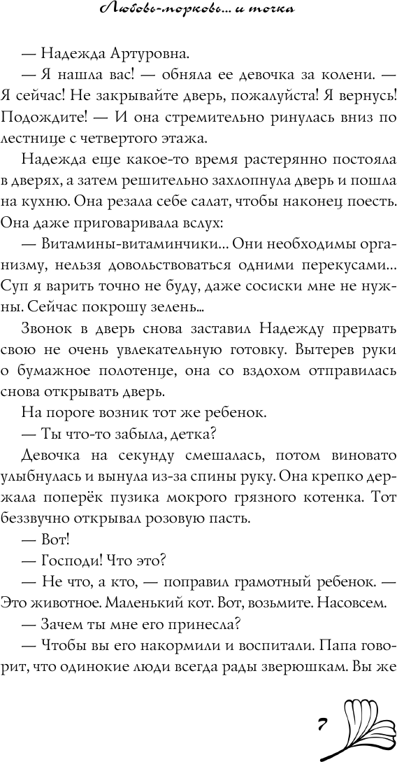 \"Любовь-морковь... и точка\" - это очередная книга Татьяны Луганцевой, которую я прочла. В нее вошли: рассказ \"Любовь-морковь... и точка\" и роман \"Бизнес-ланч для серого волка\". Книга, как и всегда, очень позитивна и поднимает настроение. Написано ярко и увлекательно. Не могла оторваться - пока не прочла полностью. Сюжет великолепный, с очень яркими, характерными героями. Больше всего понравилось, что написано с юмором.