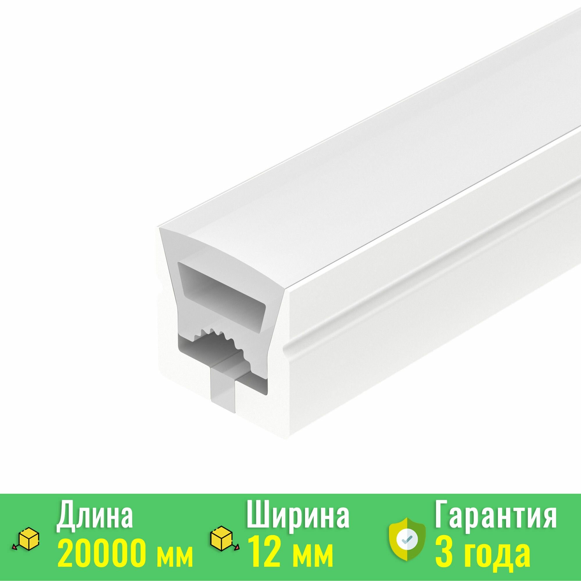 Цельнолитой силиконовый гибкий профиль, белый матовый. Габаритные размеры 20000×12×12 мм. Гнется в плоскости. Для установки во влажных помещениях необходима герметизация при помощи двухкомпонентного эпоксидного герметика. Класс пылевлагозащиты – IP65 (при соблюдении технологии герметизации). Для лент шириной от 6 до 8 мм, высотой до 3 мм и мощностью до 10 Вт/м. Поставляется в катушках по 20 м. Цена за 1 м.