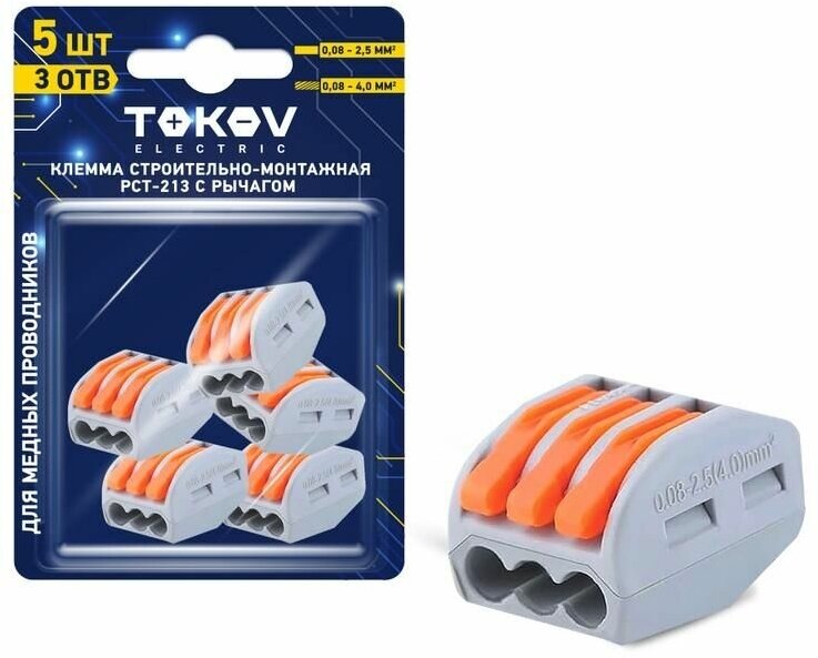 Клемма TOKOV ELECTRIC строительно-монтажная PCT-213 с рычагом 3 отверстия (блист.5шт TKE-PCT-213/BL5