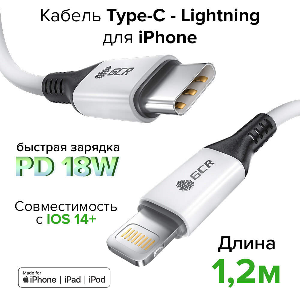 GCR Кабель 1.2m TypeC/Lightning MFI POWER DELIVERY 18 W быстрая зарядка белый корпус белый черный ПВХ GCR-53186 Greenconnect USB 2.0 Type-C (m) - Lightning (m) 1.2м (GCR-53186)