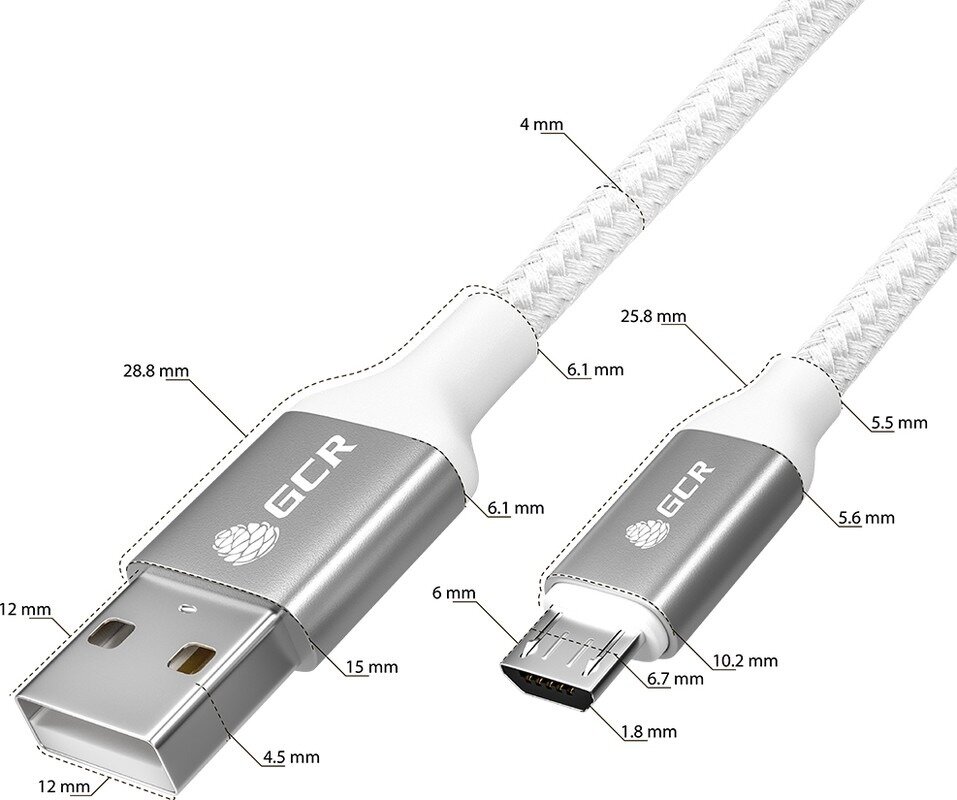 GCR QC Кабель 0.5m MicroUSB быстрая зарядка белый нейлон AL корпус серебро белый ПВХ 28/24 AWG GCR-52462 Кабель Greenconnect 0.5 м (GCR-52462)