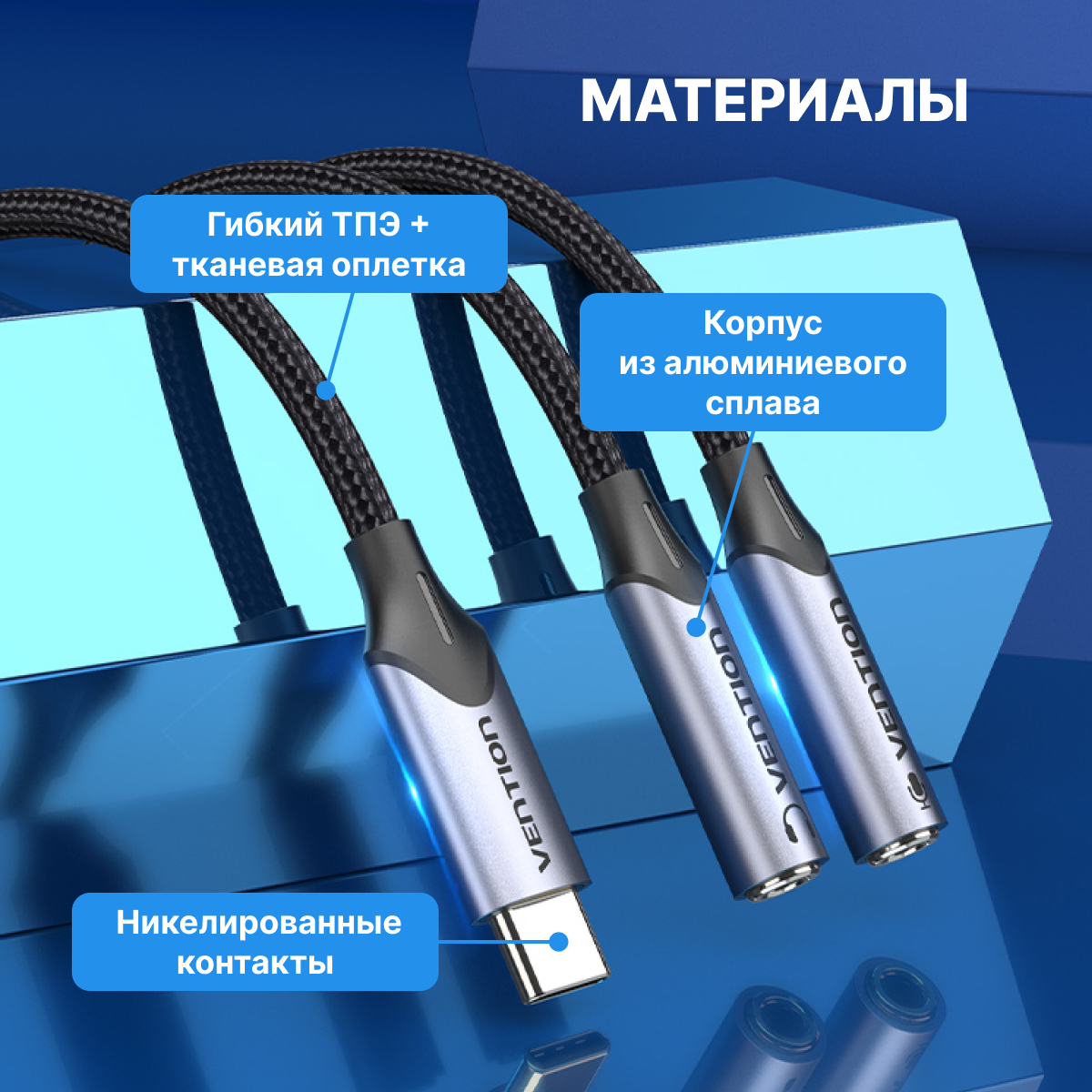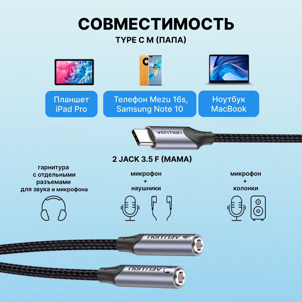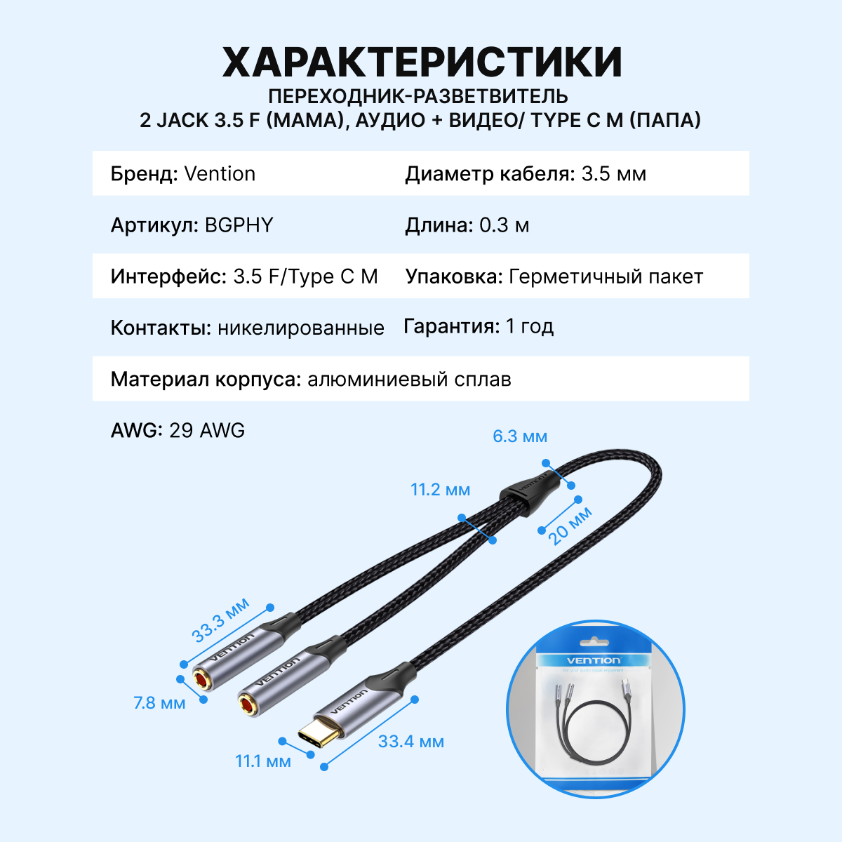 | Разъемы | USB Type-C (m) - 2xJack 3.5 (f) |